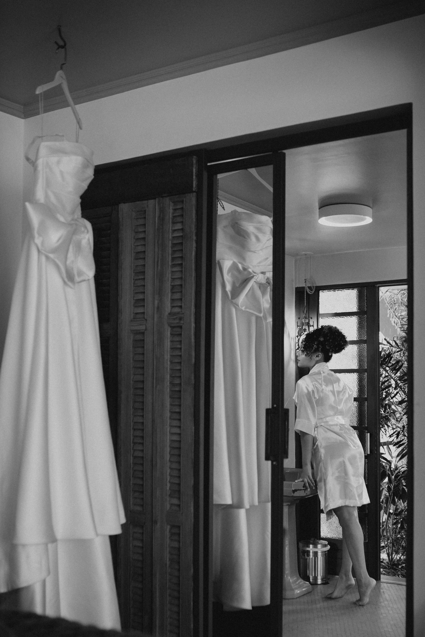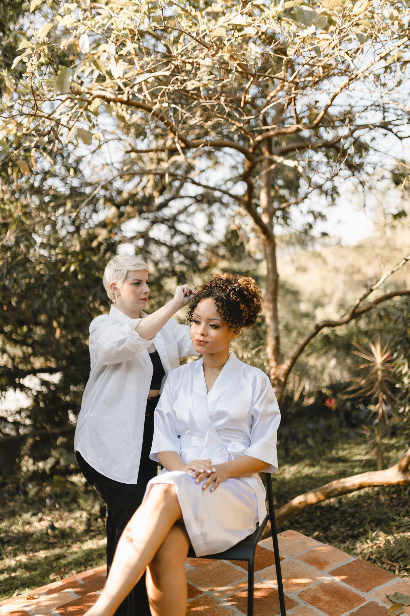 Outro item pensado com carinho foi o robe da noiva, assinado pela Balanganda Atelier. A peça de cetim branco caiu como uma luva para a Beatriz.