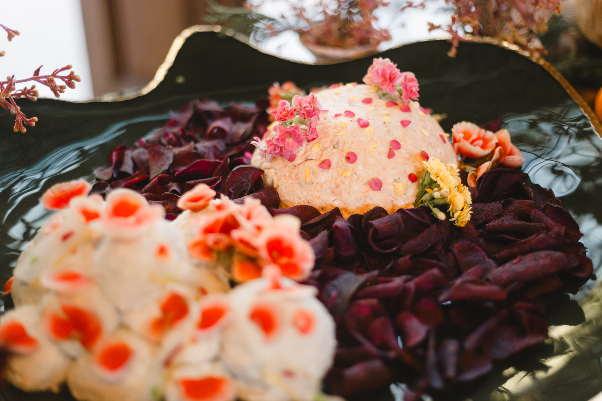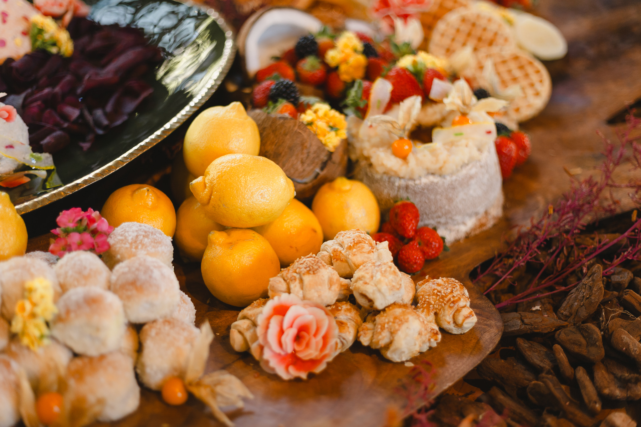 A ilha gastronômica superou qualquer expectativa, tanto pelas cores, texturas e sabores como pela estética refinada. As peças da Ritz Festas foram combinadas aos deliciosos preparos do buffet, rendendo um verdadeiro jardim sobre a mesa.