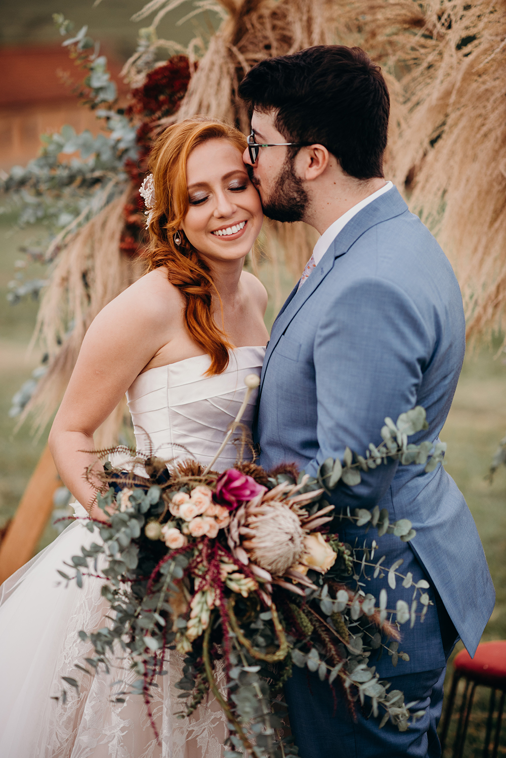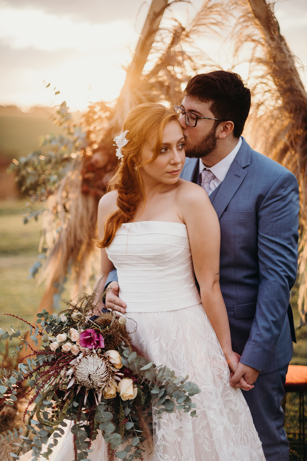 Temos um casal romântico e feliz, vestido clássico, buquê desconstruído e o melhor da junção do tradicional com o boho.