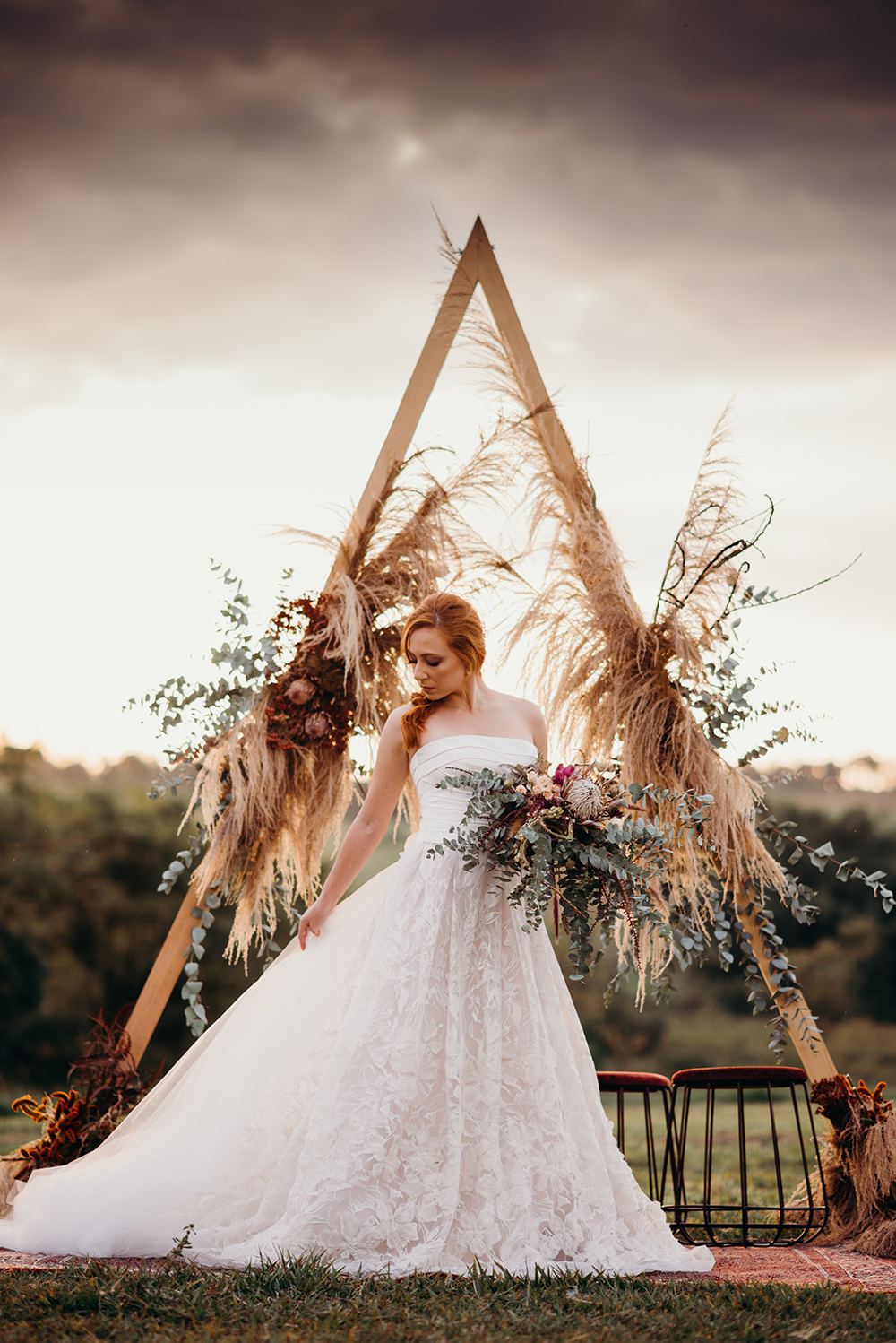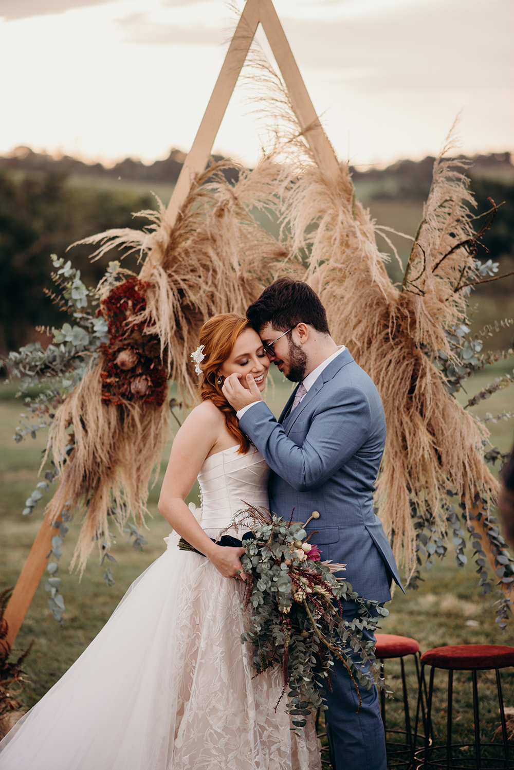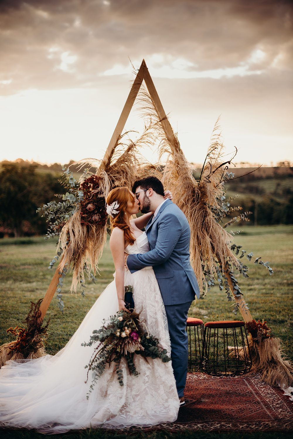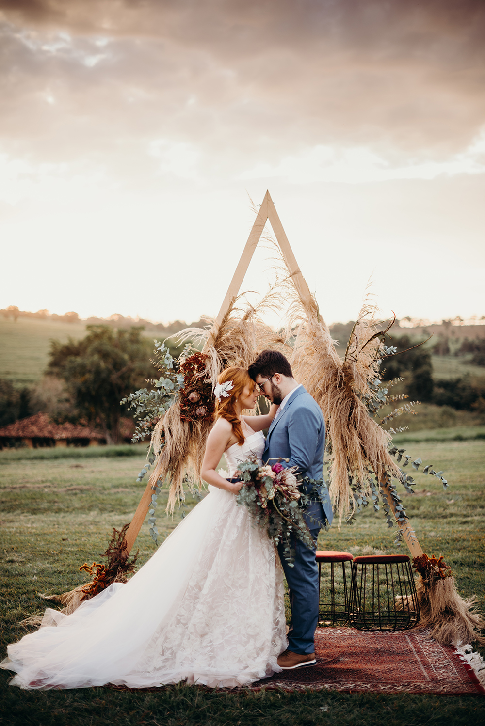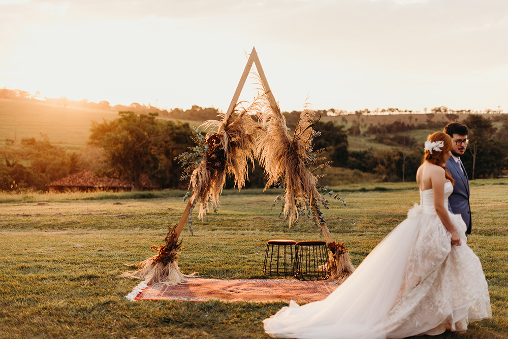 Amei a decoração do Studio Realejo, que uniu o altar geométrico com o detalhe de capim dos pampas – uma forte tendência para casamentos ao ar livre.