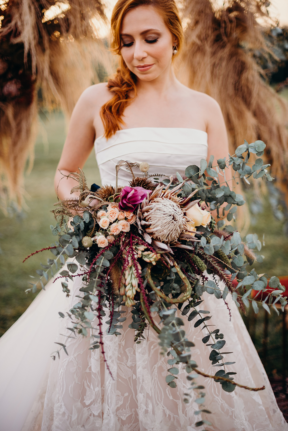 A Studio Realejo, trabalha com formas mais orgânicas, respeitando a anatomia de cada flor. Foi escolhido um maxi-bouquet com um mix de folhagens, sementes, raízes e como destaque escolhemos uma flor da África do Sul que ganhou o coração das noivas brasileiras, a King Protea.