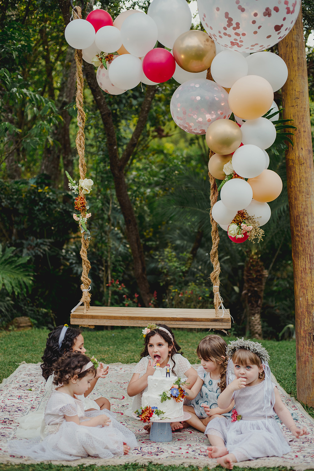 Os vestidos (noiva e daminhas) são da Lascivité e se destacam pela leveza, beleza e liberdade, afinal, é essencial que as meninas fiquem à vontade, podendo brincar e se divertir.