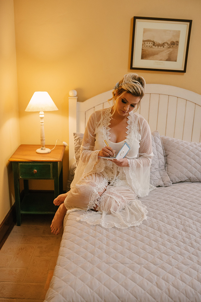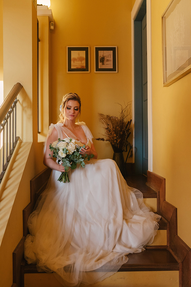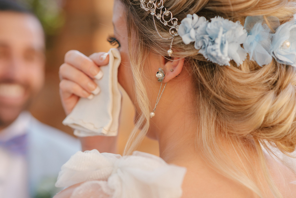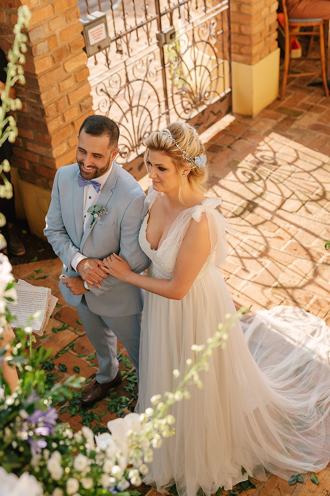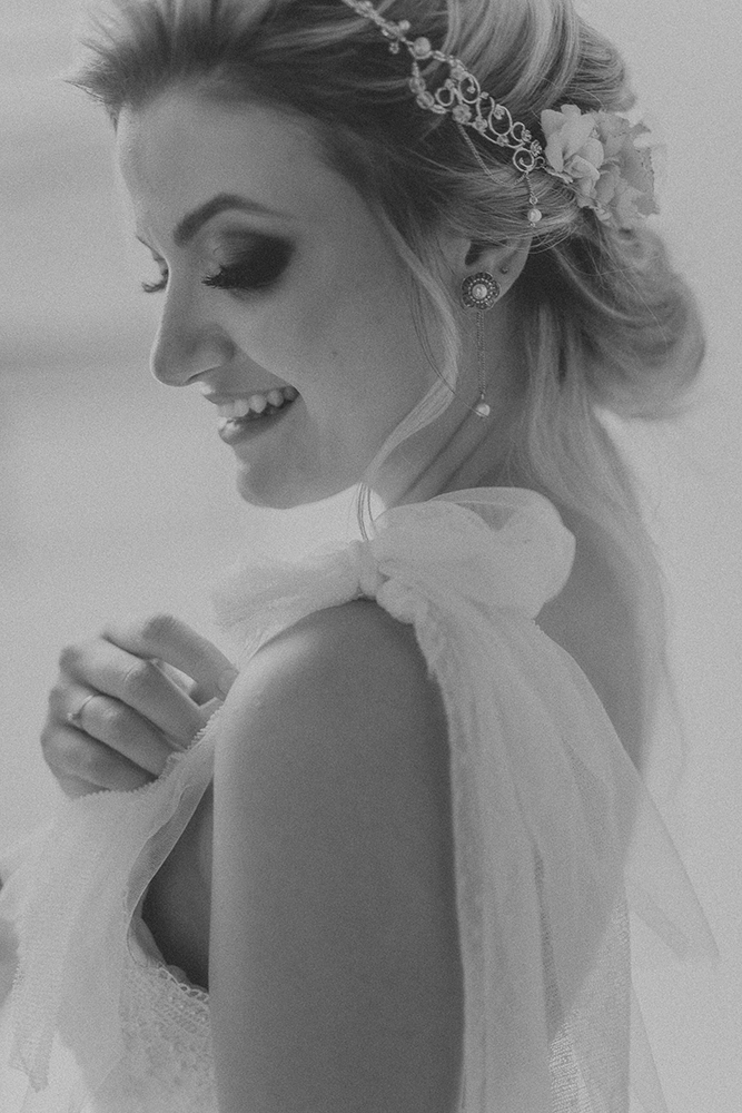 E a lista de itens encantadores segue no acessório, no vestido de noiva e na beleza natural, com cabelos presos e olhos marcados. Na música agradável que embalou a cerimônia, na celebração leve e emocionante…
