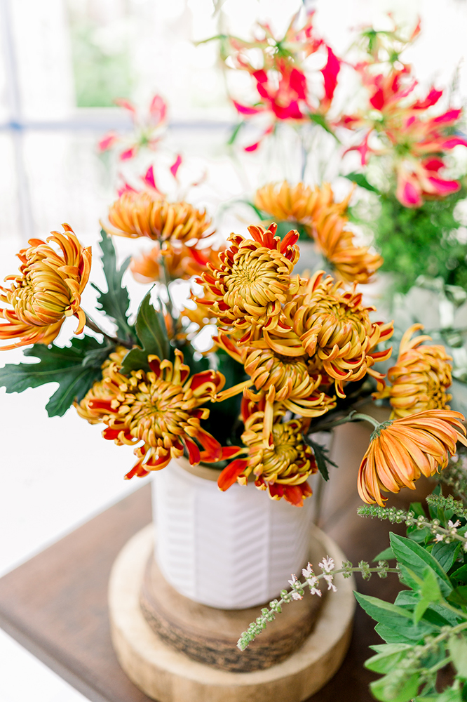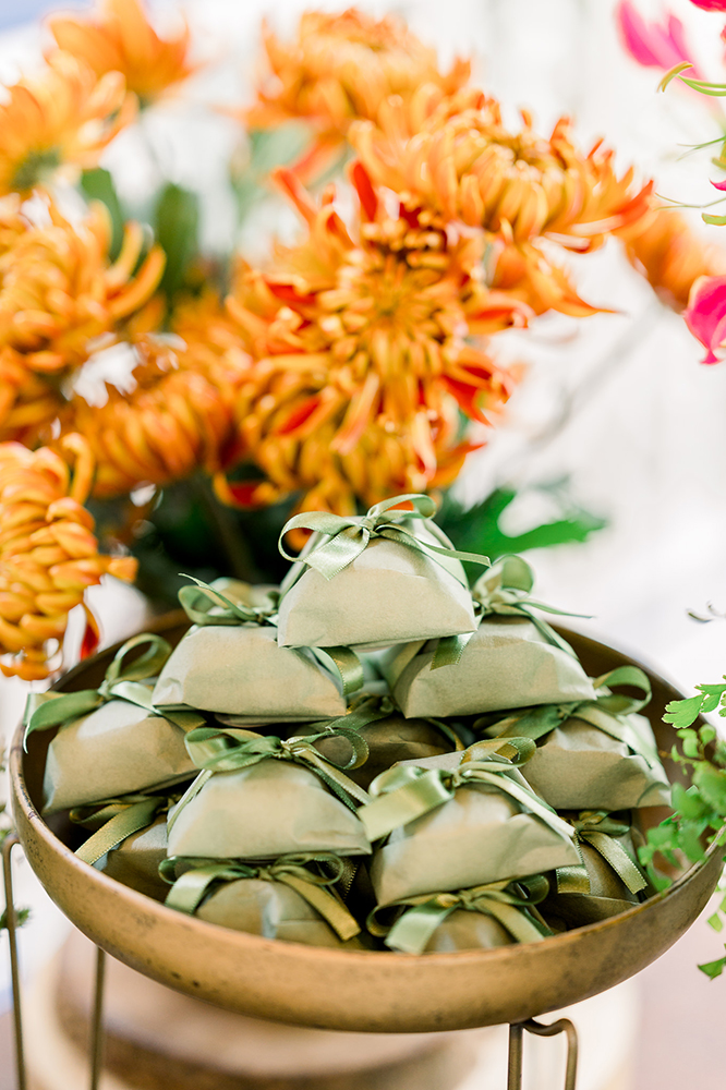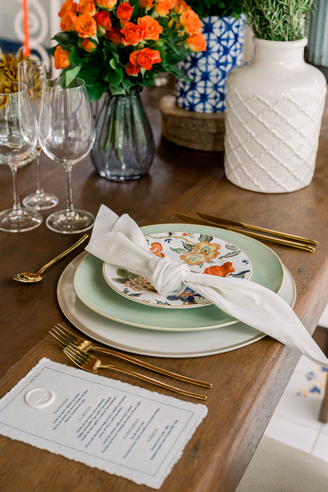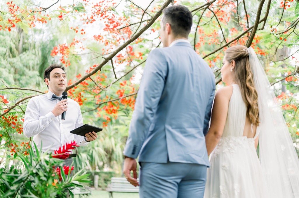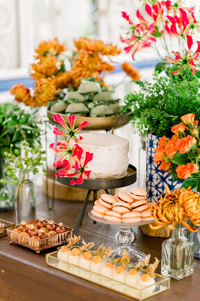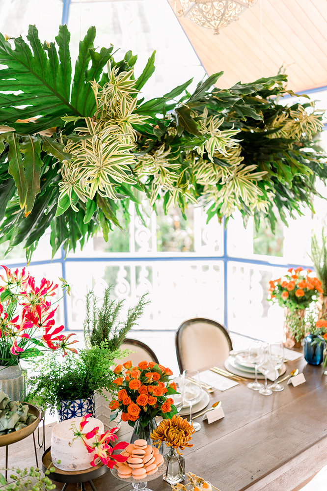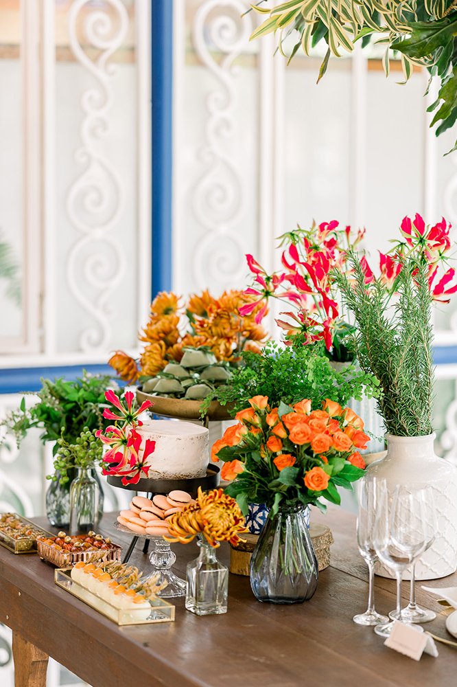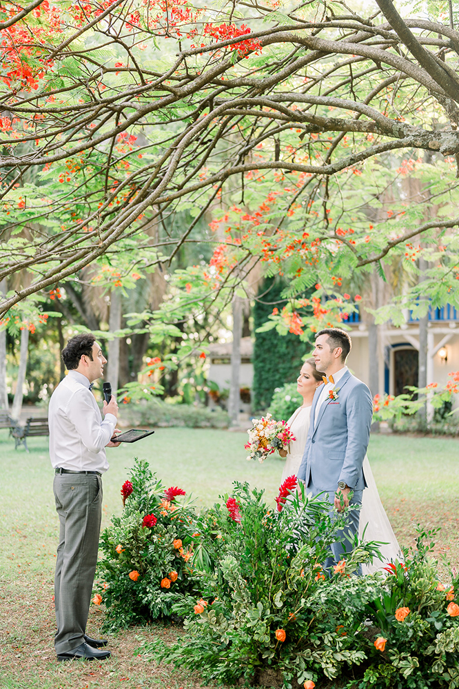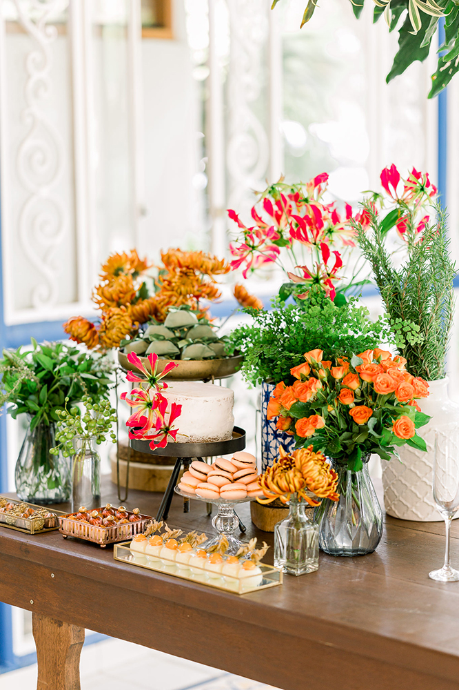 Norteamos o conceito com base na florada do Flamboyant. A partir do movimento da copa da árvore pensamos na papelaria, altar e decoração. Para a paleta, inclusive, buscamos vibração, trazendo um mix de plantas e flores, ressaltando a crescente procura da interação entre o botânico e orgânico.