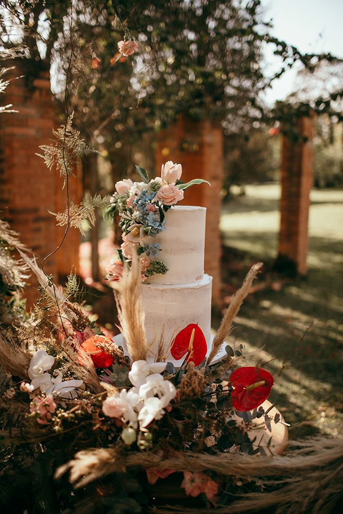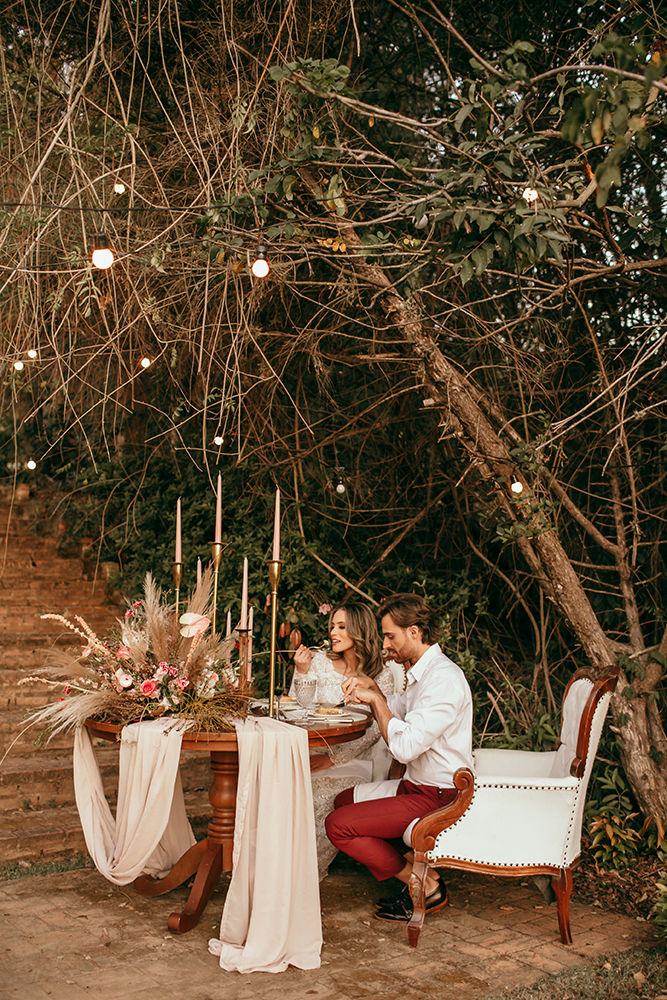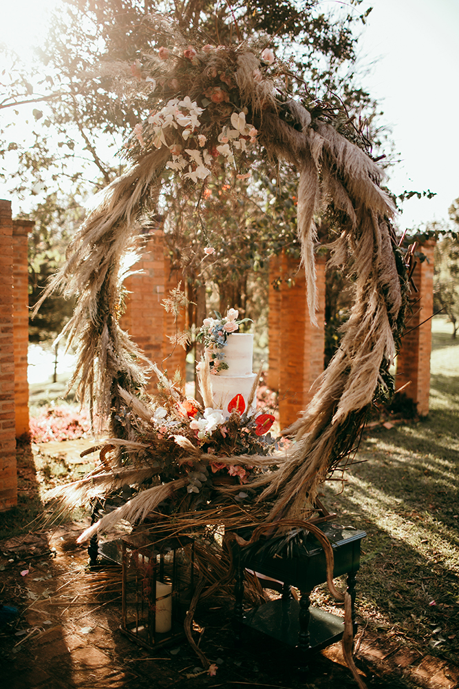 Reparem que a decor explorou não só o famoso capim dos pampas, mas também as folhagens secas e muitas flores em tons românticos. Assim, o elopement wedding boho ganhou graça e equilíbrio, sem cair na obviedade do estilo boêmio.
