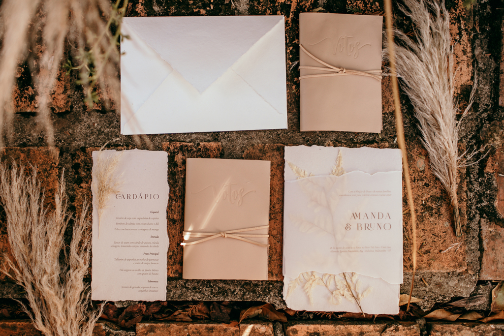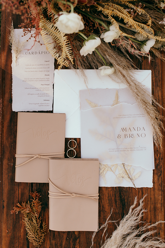 Além dos cadernos de votos, a Estúdio Pinus preparou a papelaria perfeita. O convite com papel vegetal ficou fantástico!