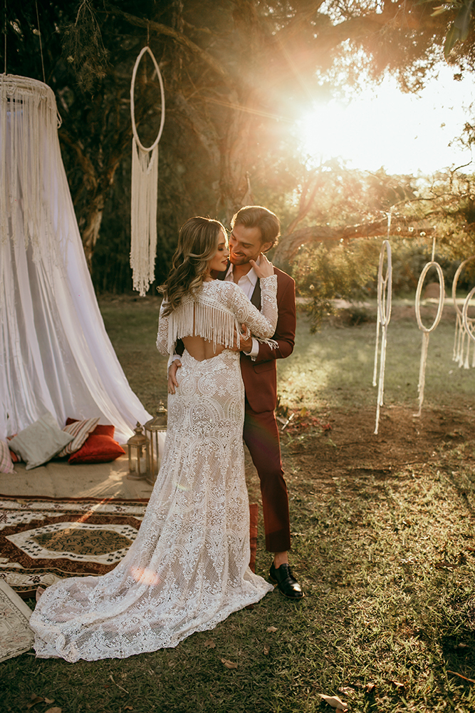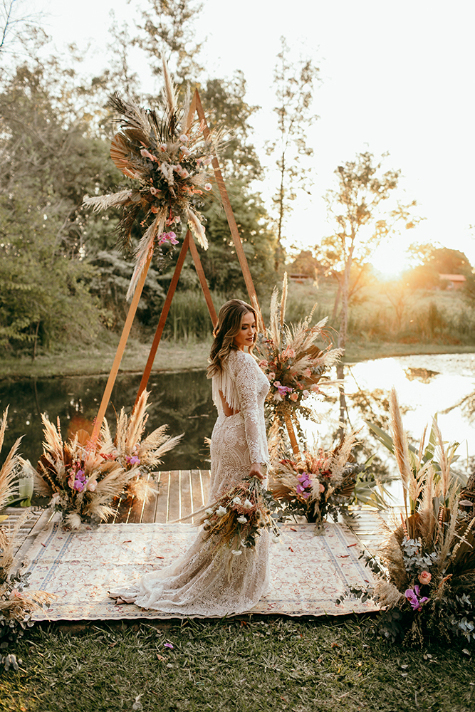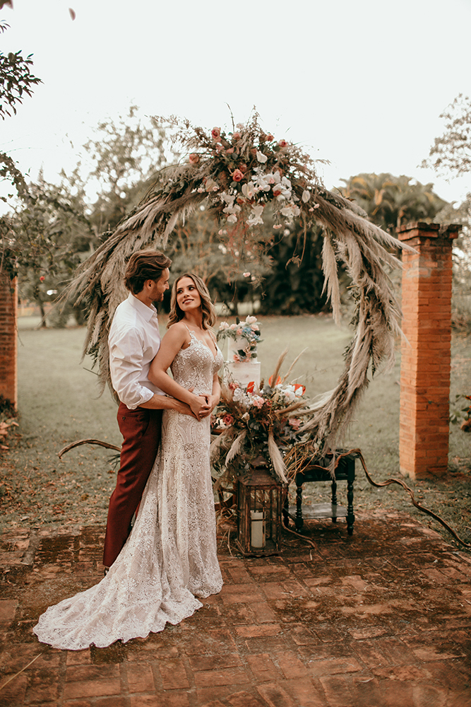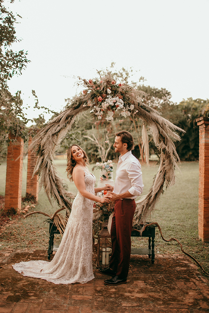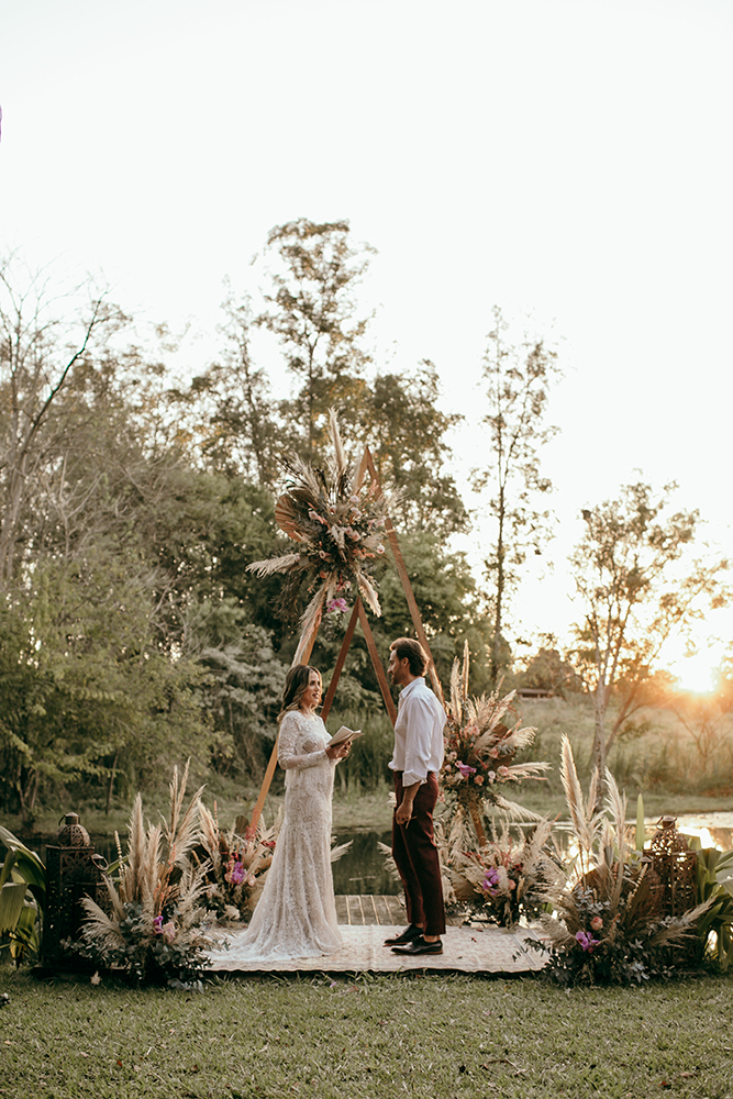 Amanda e Bruno tiveram um elopement wedding boho, com direito a macramês, capim dos pampas e tudo mais que o estilo rústico chique merece.