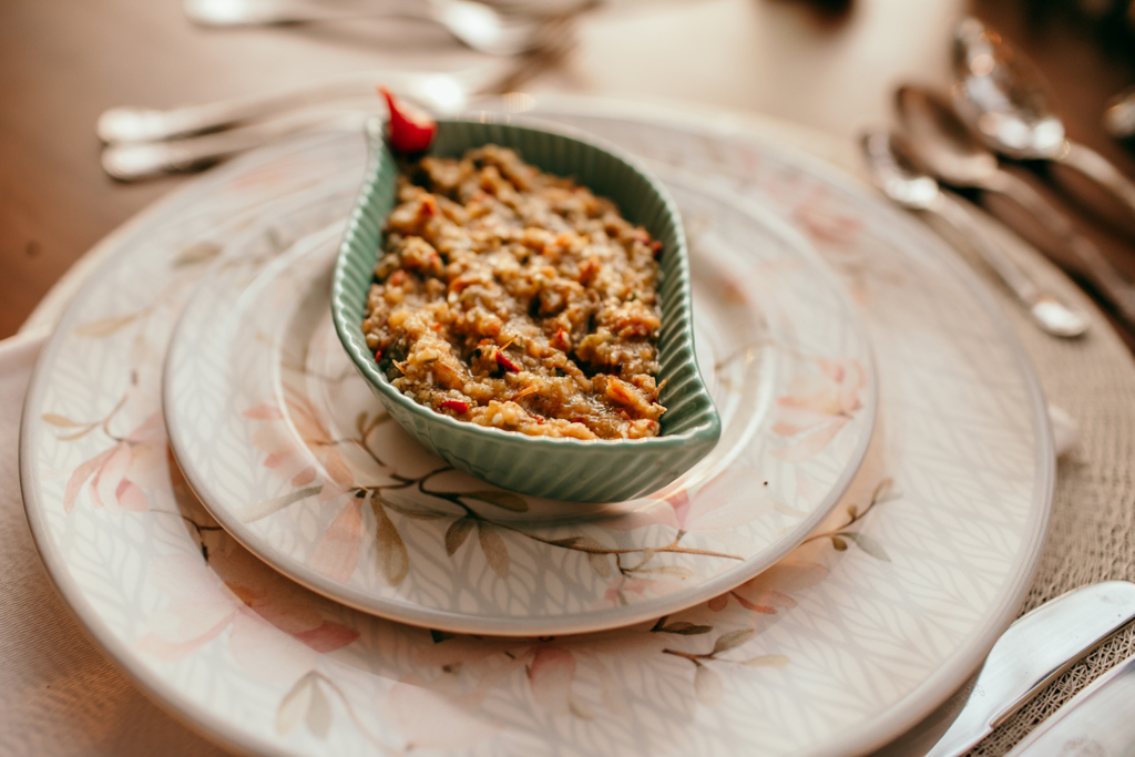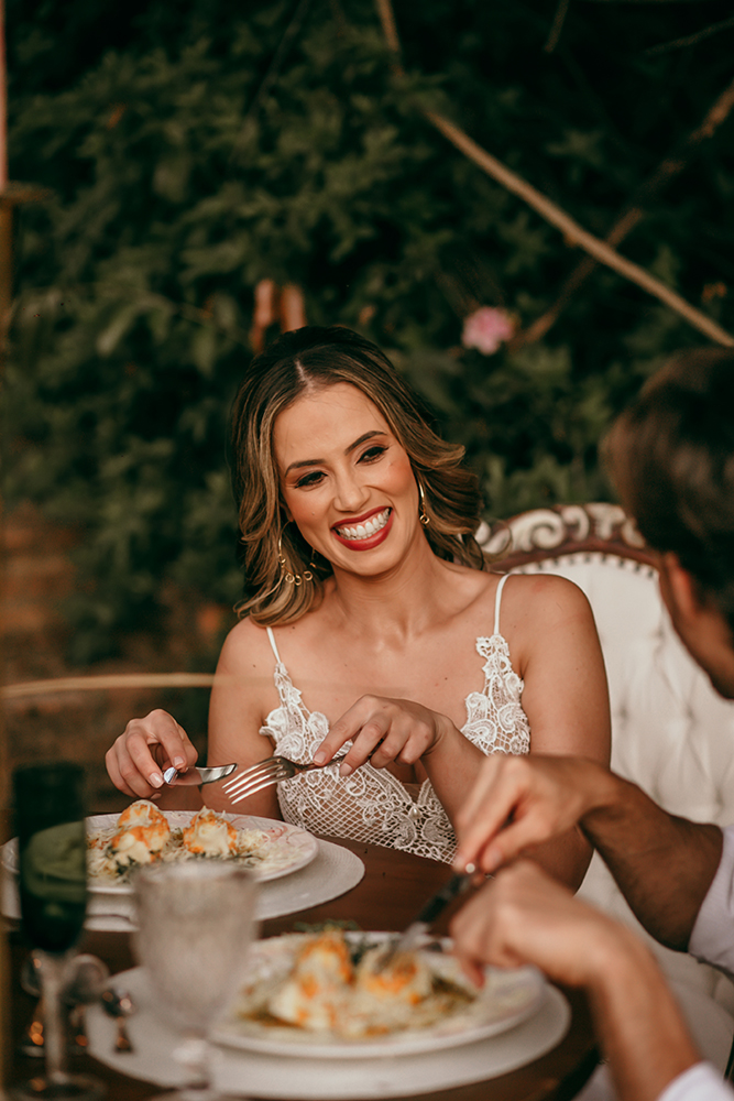 Do vestido de noiva ao buffet, todos os itens são elegantérrimos, ainda que tenham tudo a ver com o clima bucólico e natural.