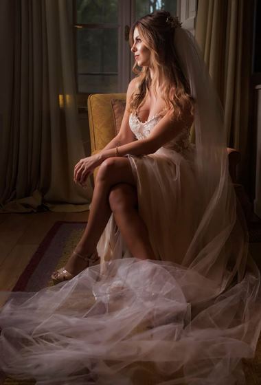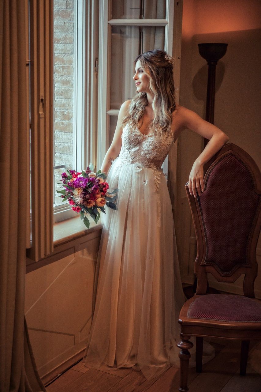 As costas decotadas, o leve tom champanhe, a sobreposição de tule e as flores em 3D garantiram muito charme ao look, que além de romântico é leve e charmoso. Fica a dica para quem sonha com um lindo casamento ao ar livre.
