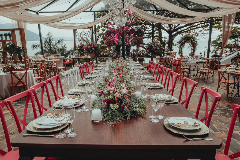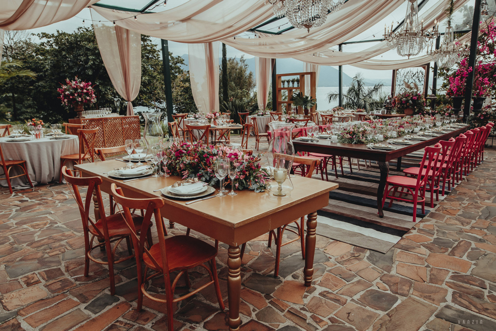 A decoração romântica com toque moderno e pinceladas de cor de rosa combinou perfeitamente com o clima do destination wedding.