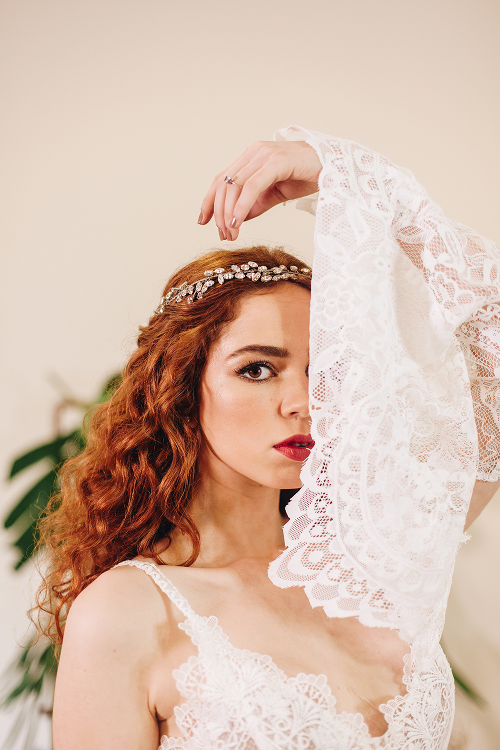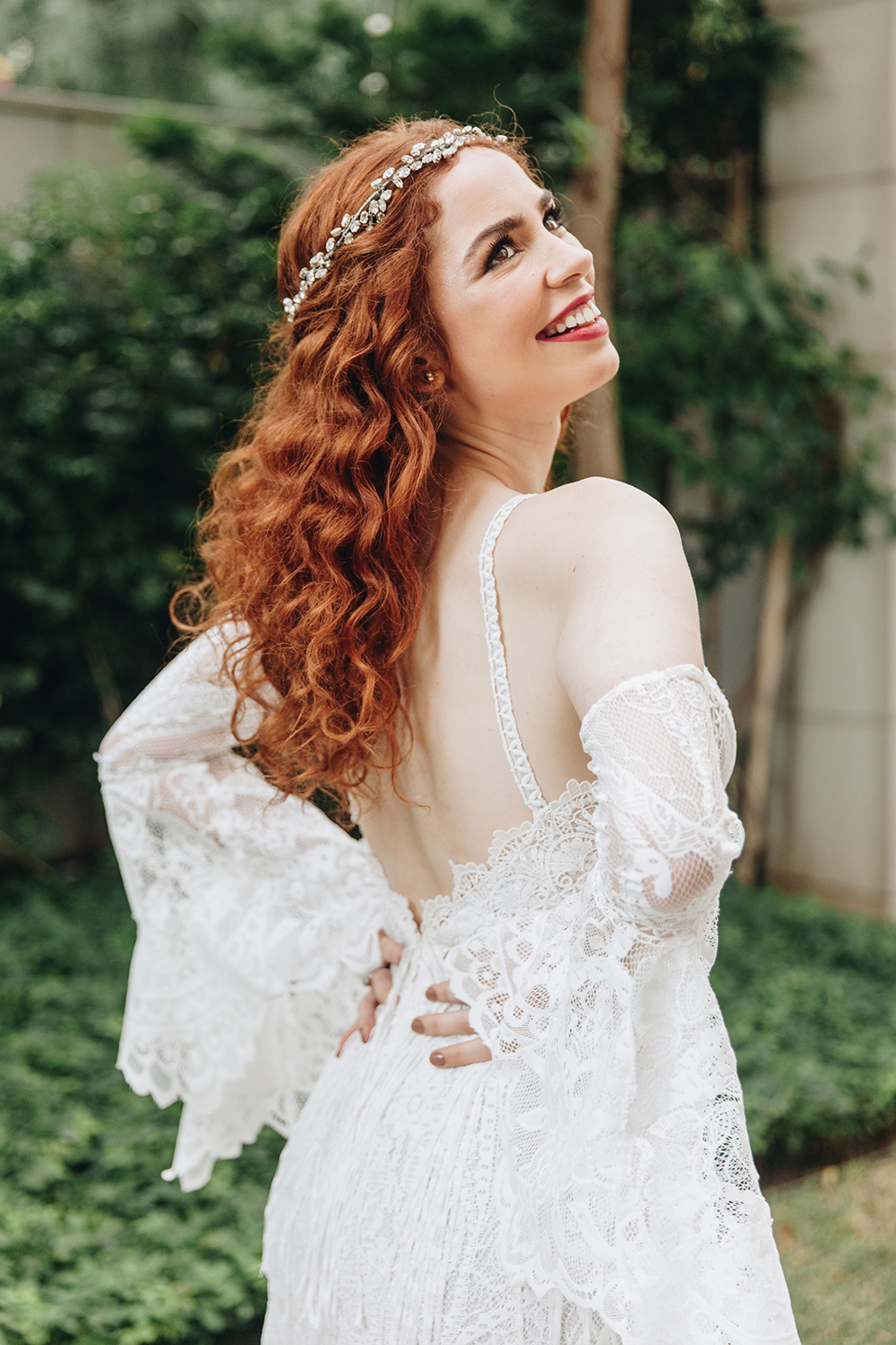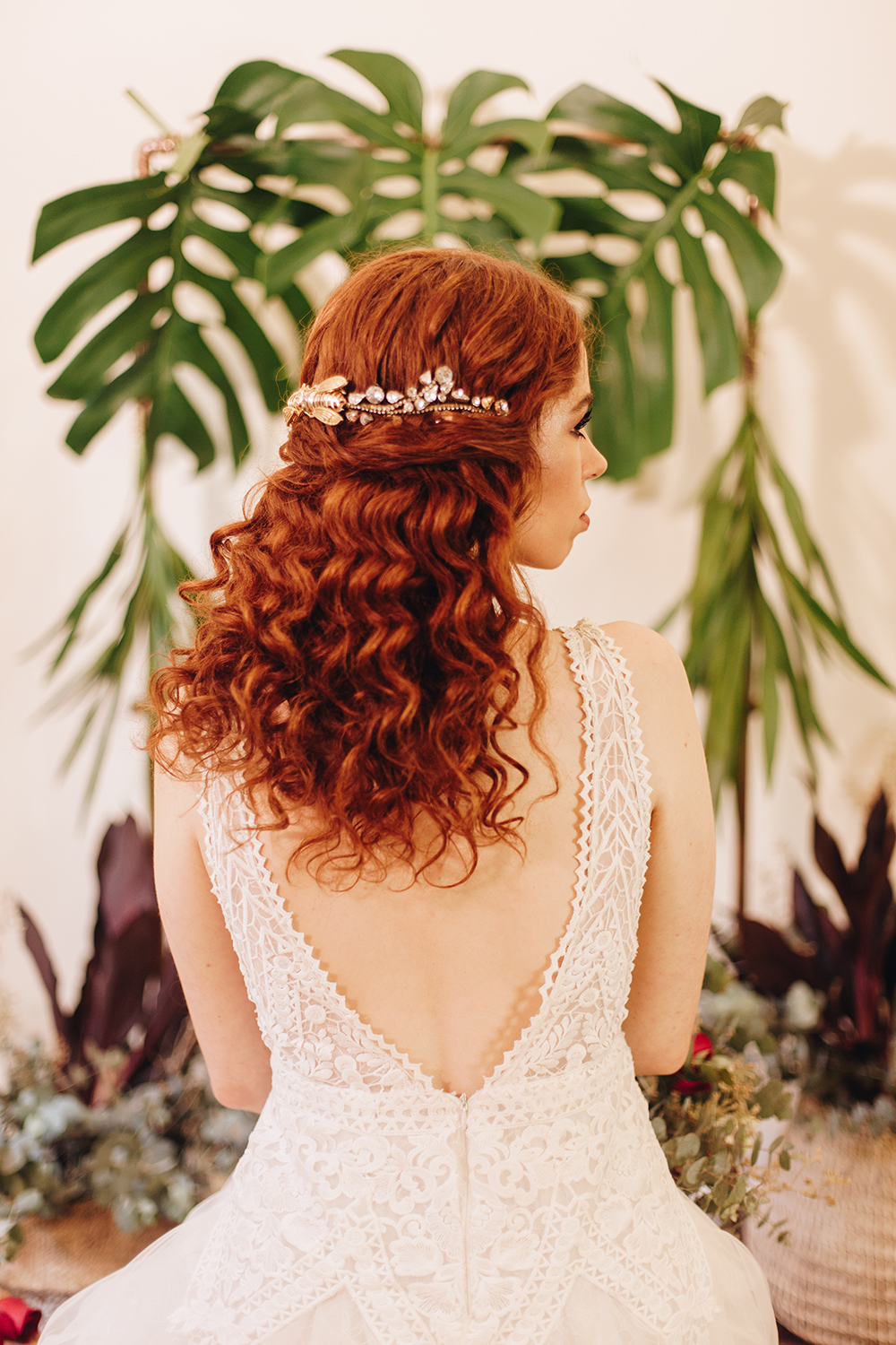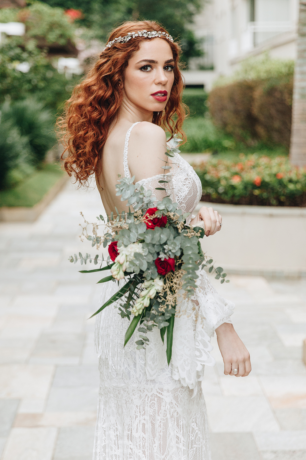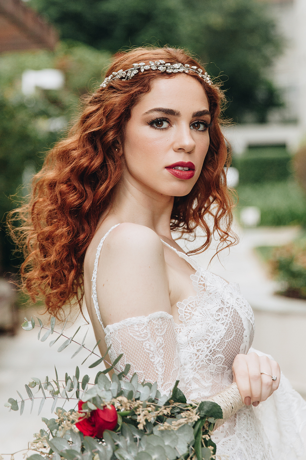 O cabelo também teve mudanças ao longo do editorial. Foram quatro penteados diferentes, pensando principalmente em noivas com cabelos cacheados, que queiram valorizar os cachos no grande dia.