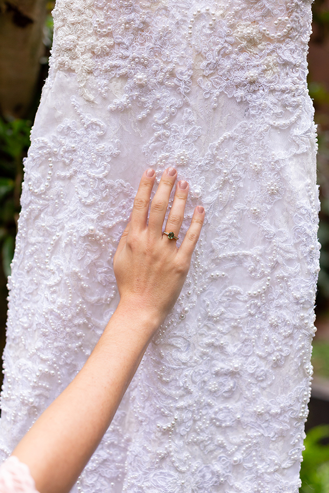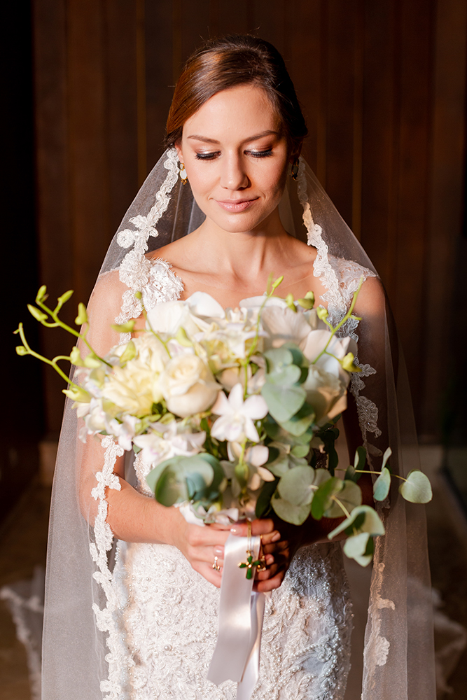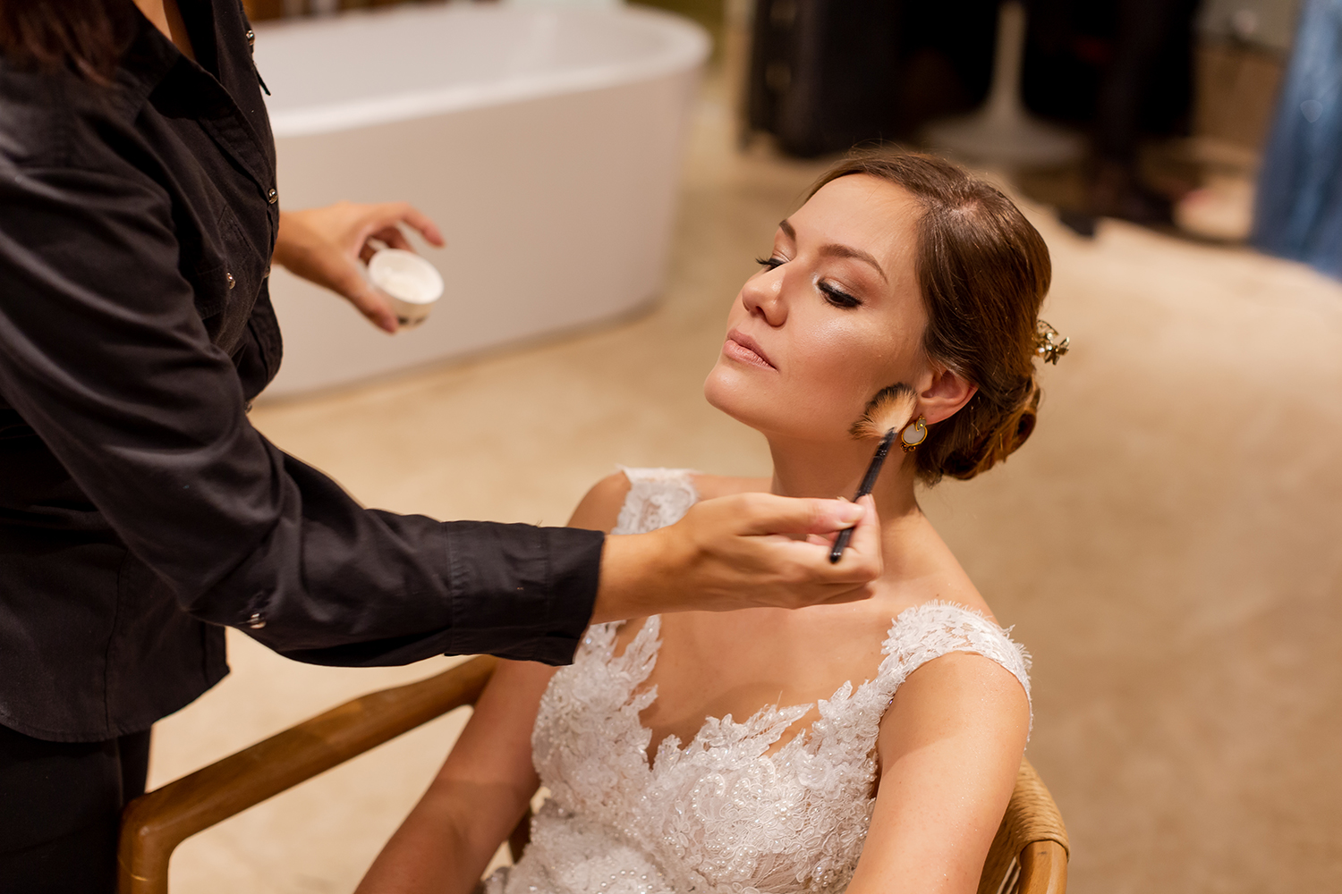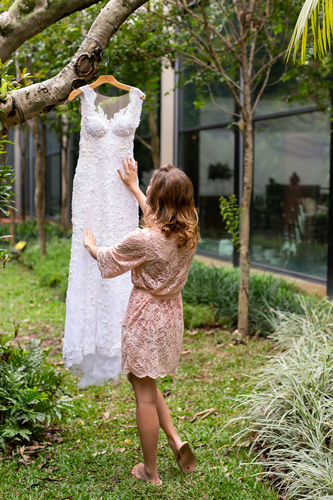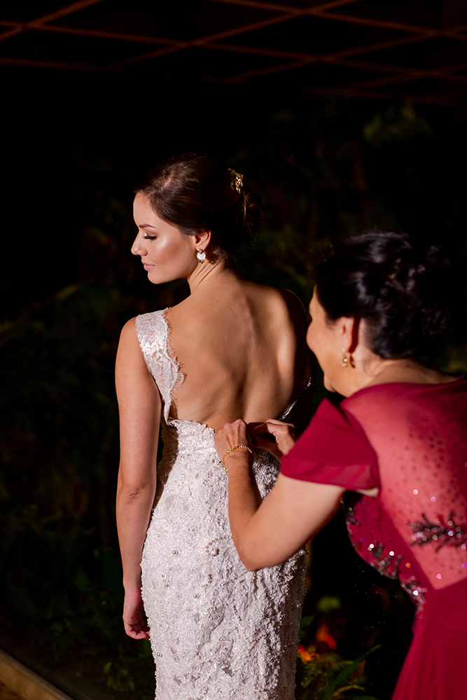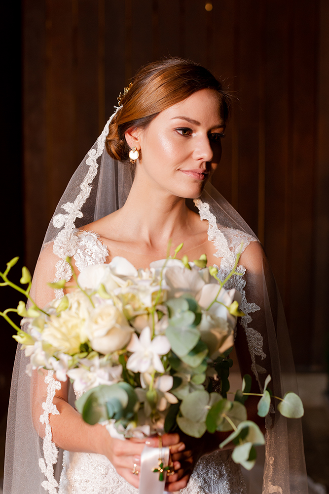 Além da make impecável e do penteado sob medida para o casamento tradicional, Gabriela escolheu um belo vestido em renda. O combo perfeito para um casamento atemporal.