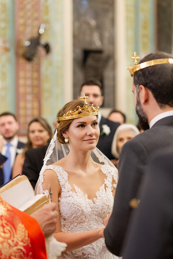 Para que todos acompanhassem a cerimônia, preparamos um pequeno livreto, com as tradições e suas origens. O ponto alto, sem dúvida, foi a colocação das coroas – o casal fica frente a frente, e enquanto rezam-se as bençãos, olham nos olhos um do outro. É extremamente emocionante.