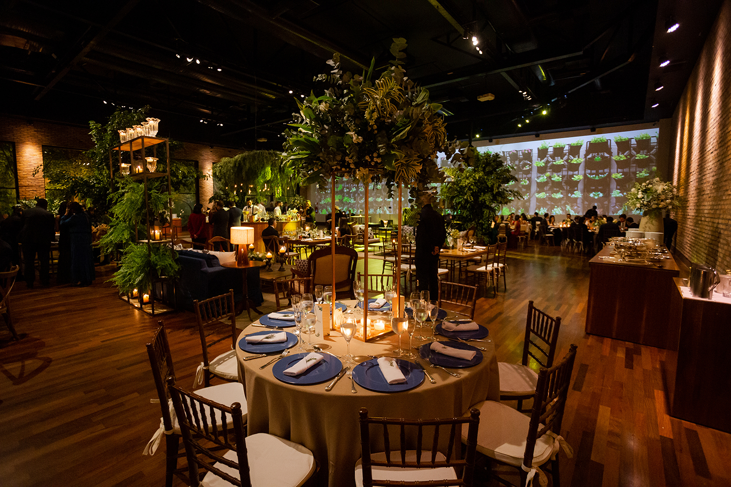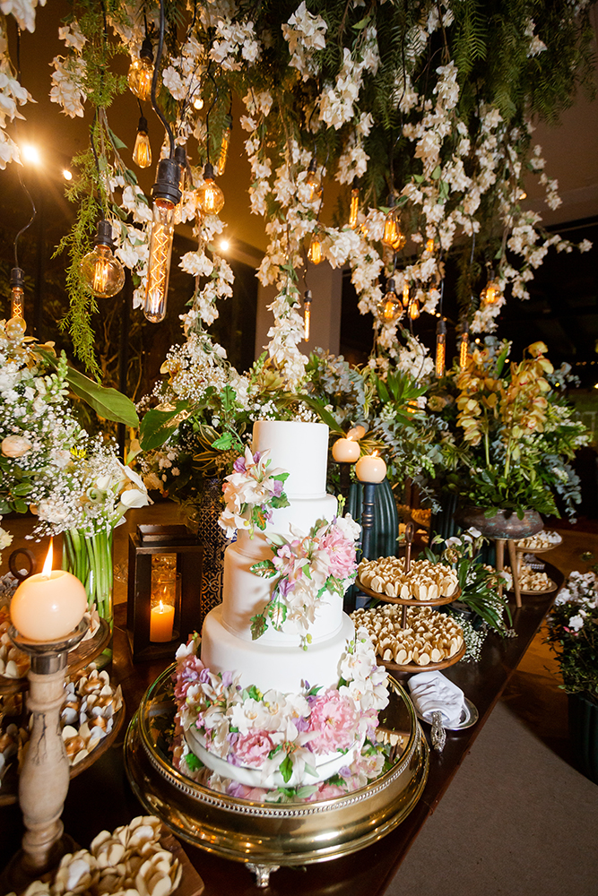 Apesar de clássica, a decor também teve muita bossa. Mesa de bolo iluminada por lâmpadas pendentes, arranjos delicados e uma série de itens especiais deixaram os ambientes ainda mais bonitos!