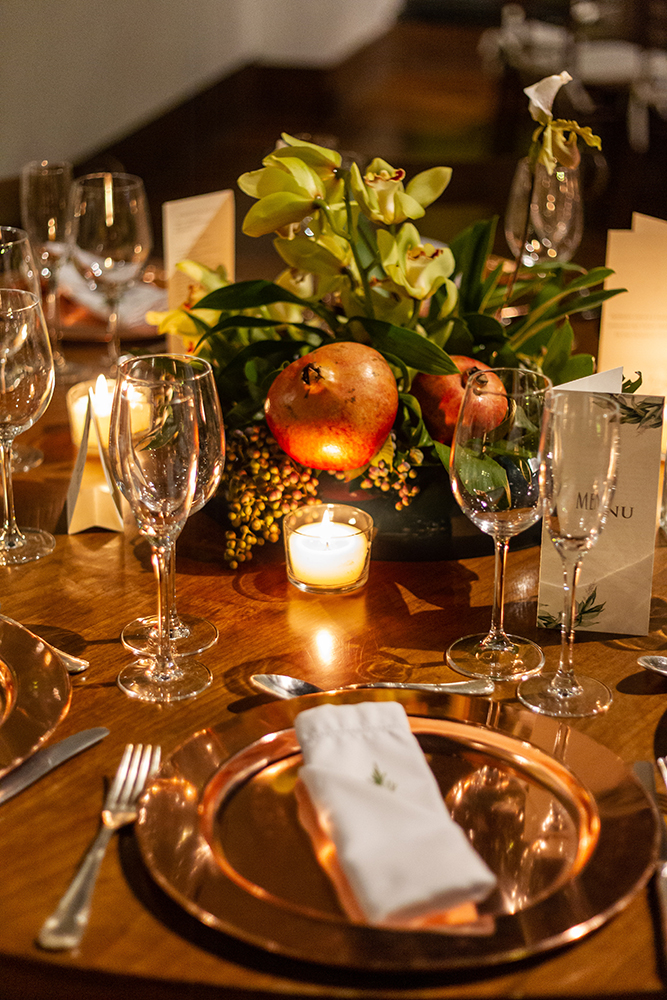 ♥ A decoração, com direito a romãs e muito verde e branco.