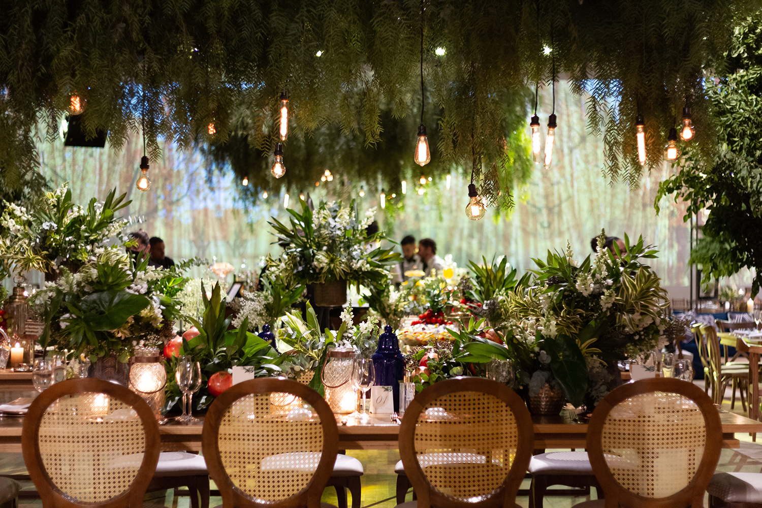 A decoração da Cris Barbosa foi simplesmente divina, um verde e branco contemporâneo como eu sempre sonhei. Ela uniu elementos portugueses, como as cerâmicas em azul e branco, com detalhes armênios, como as romãs destacadas nos centros de mesa. Além disso, ela fez uma linda homenagem à minha avó no buquê verde e branco com girassóis, suas flores preferidas.