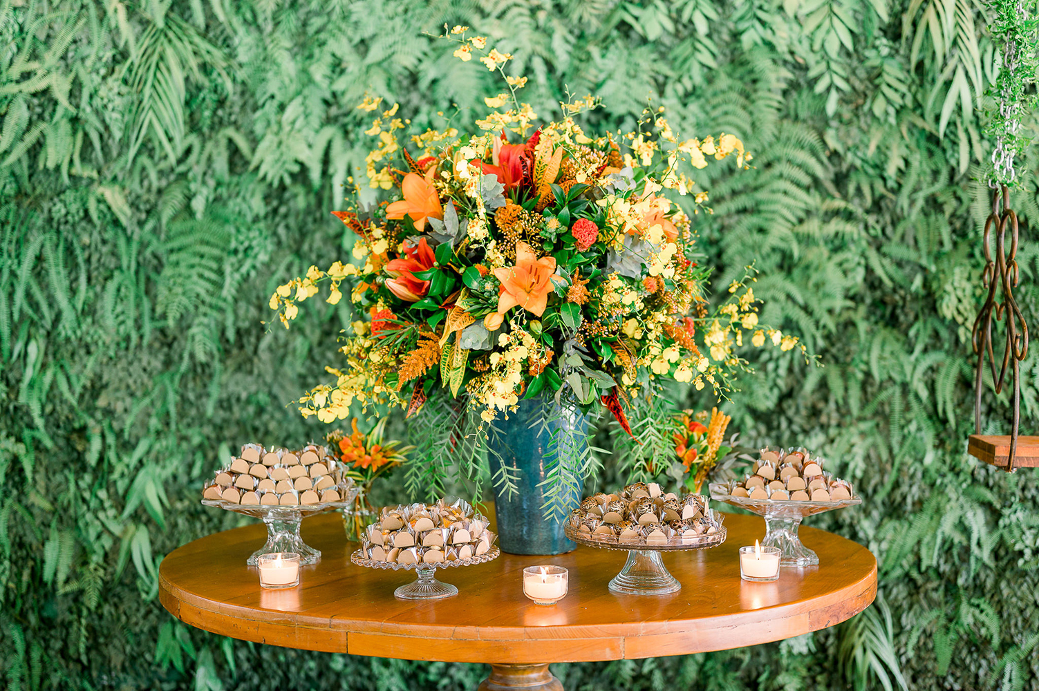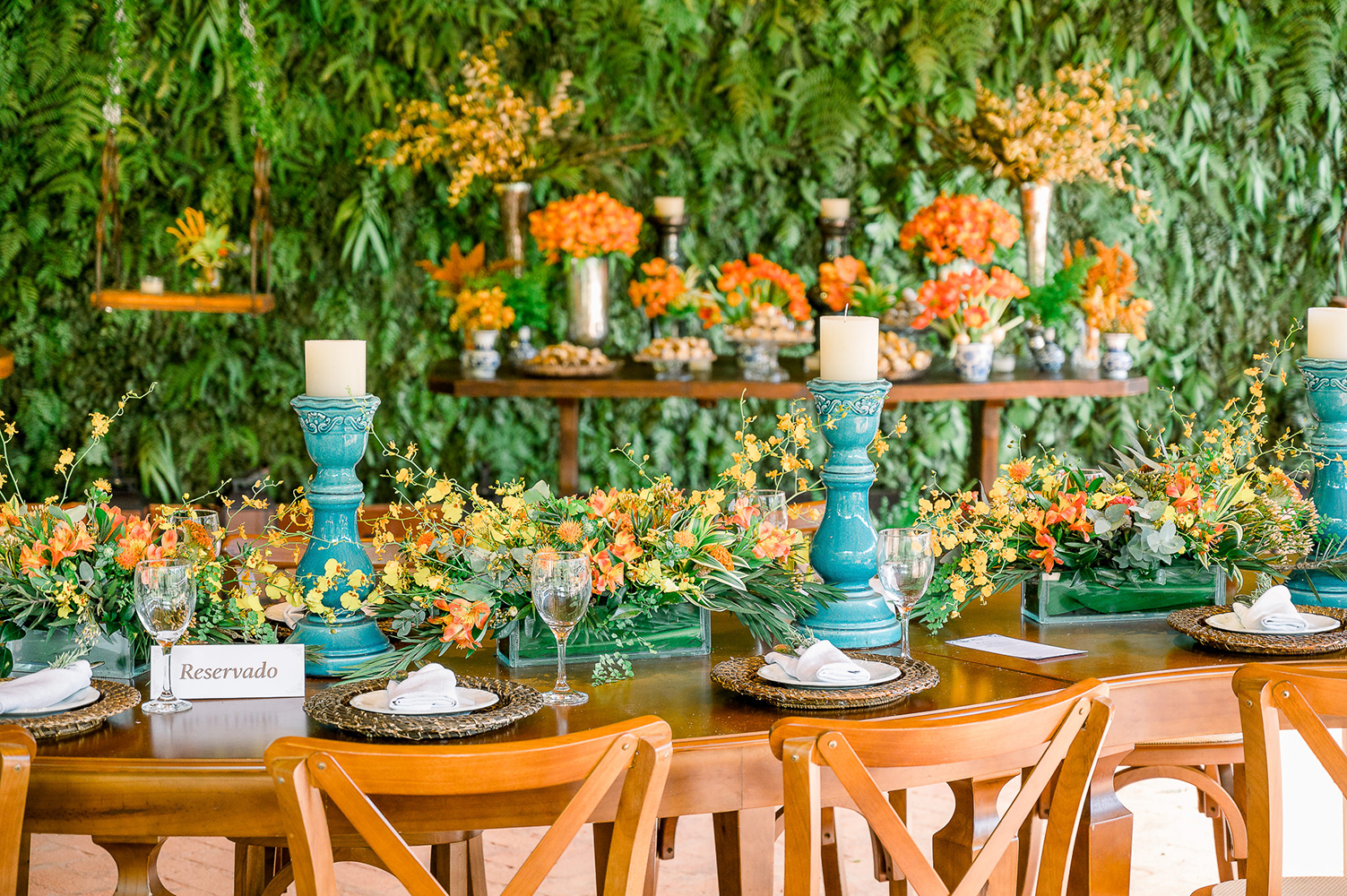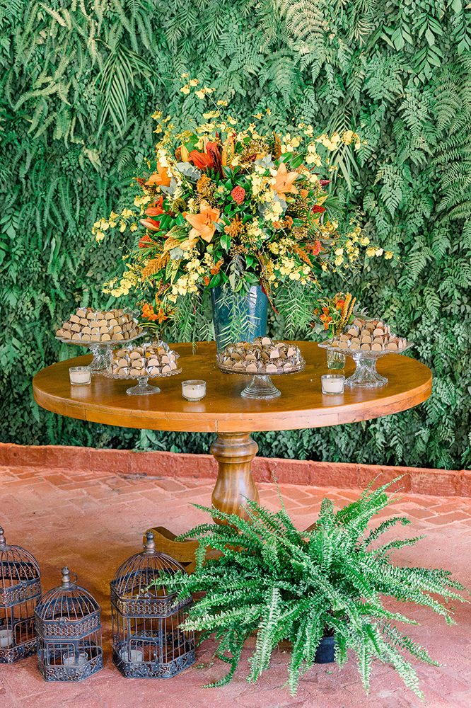 Já na mesa de doces, muito amarelo e laranja em arranjos que vibram alegria.