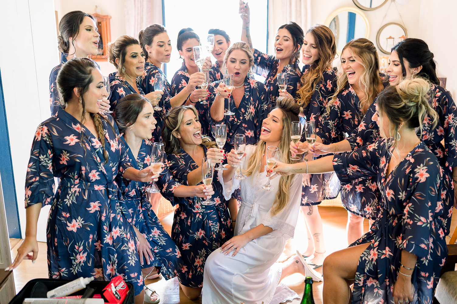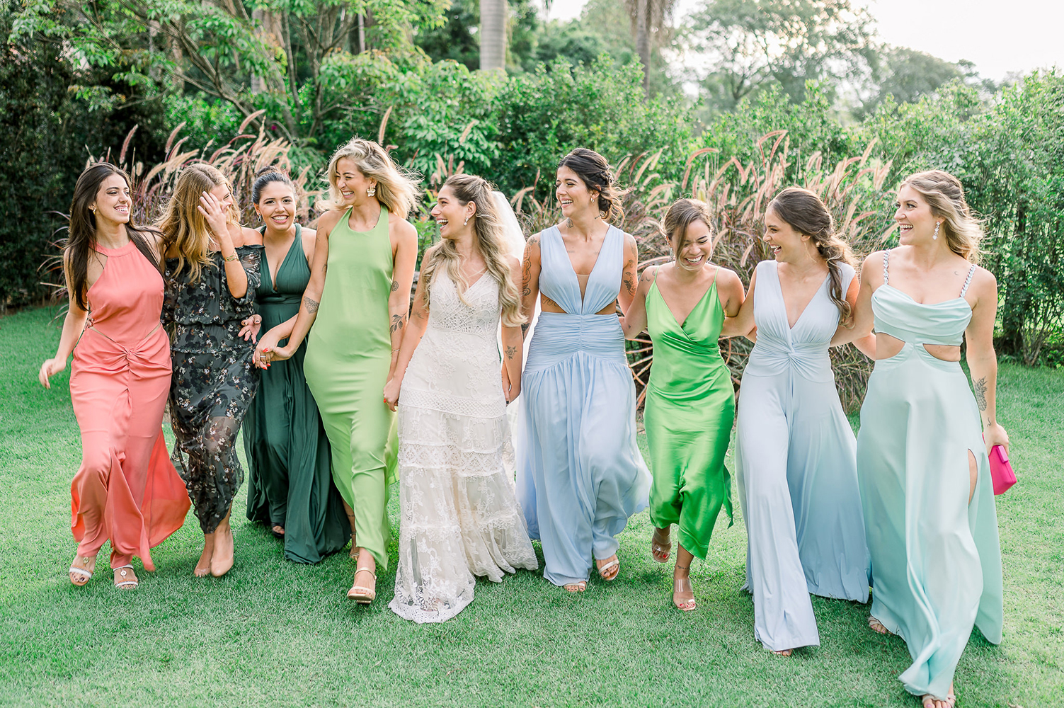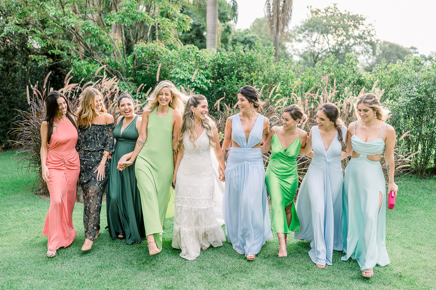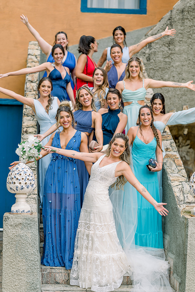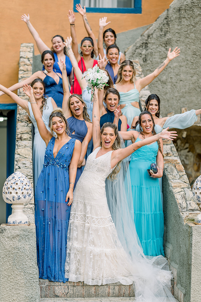 Se acaso você adora madrinhas combinando, repare nas escolhas da vez, com madrinhas em tons de azul. Amei o resultado!