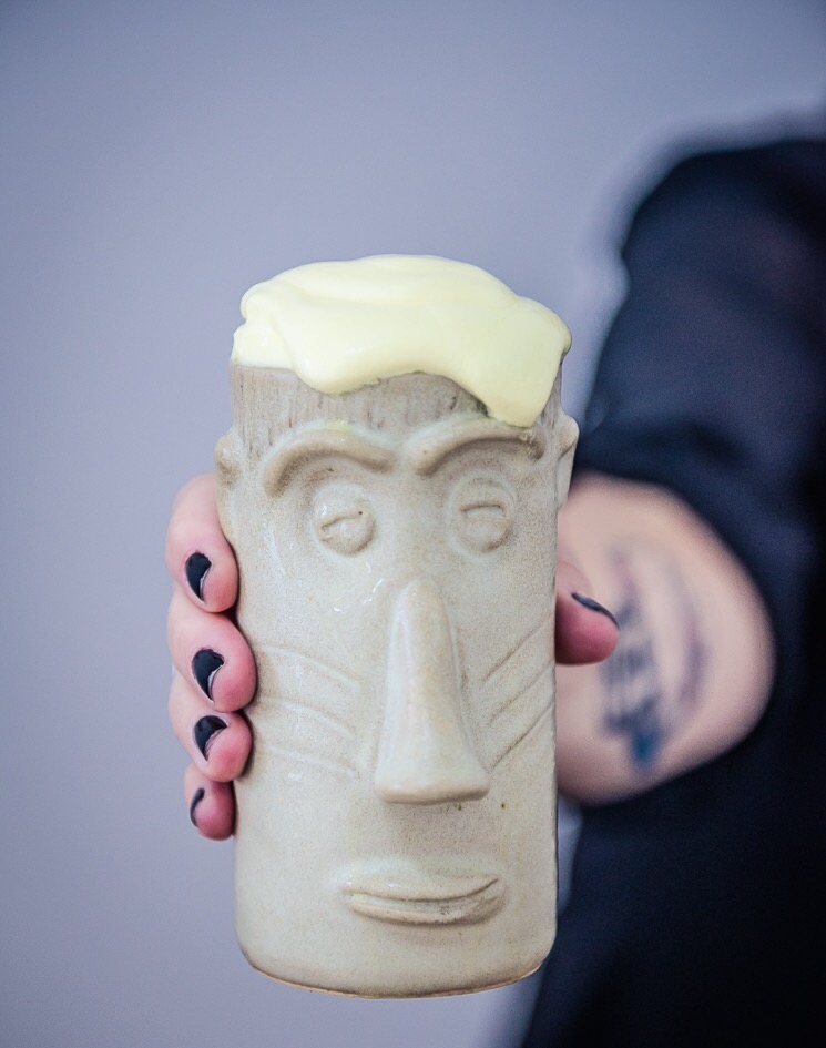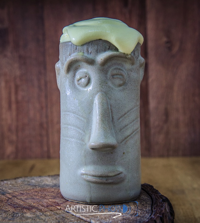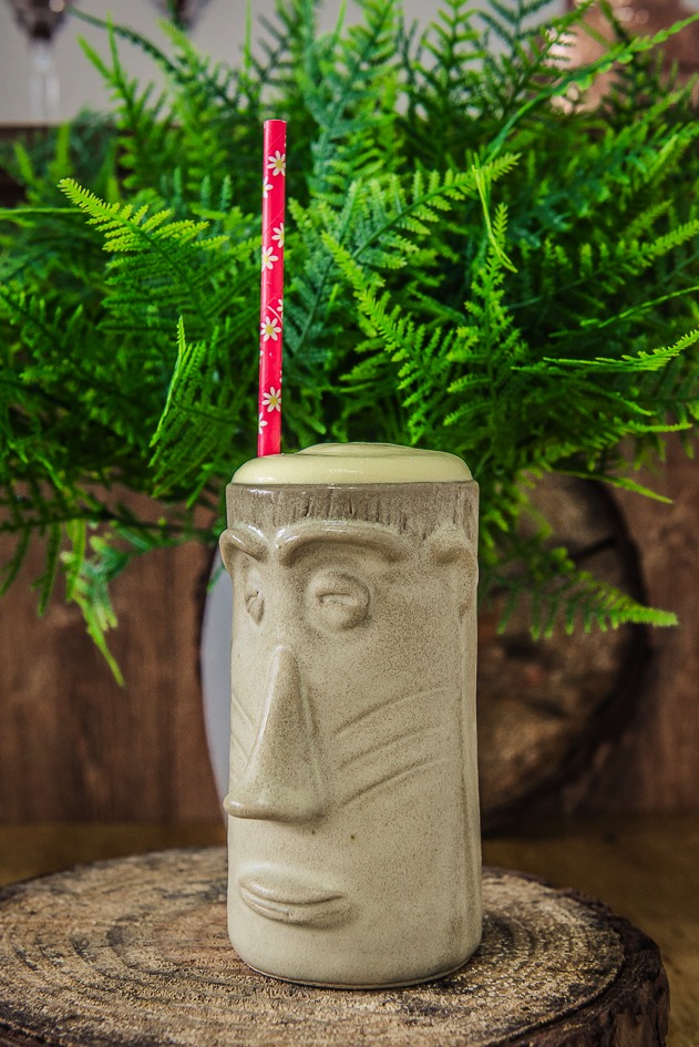 Servido em um copo estilo Rapanue a base de gin e chantilly sabor de abacaxi.