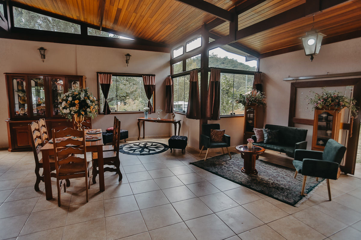 Com possibilidade de fazer a cerimônia ao ar livre ou em uma cobertura de madeira rústica, os noivos também contam com uma salão lindo e mobiliário diferenciado.