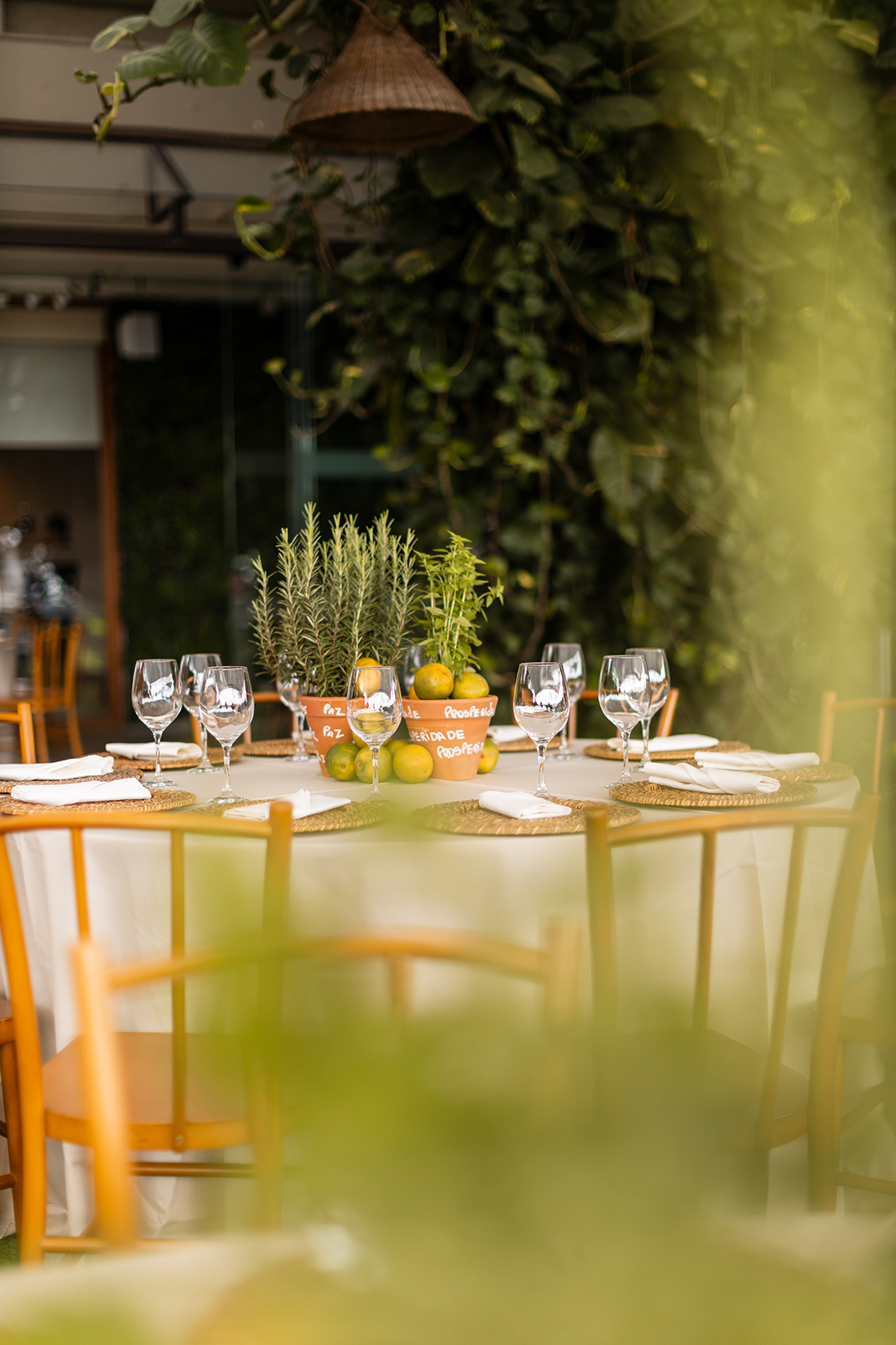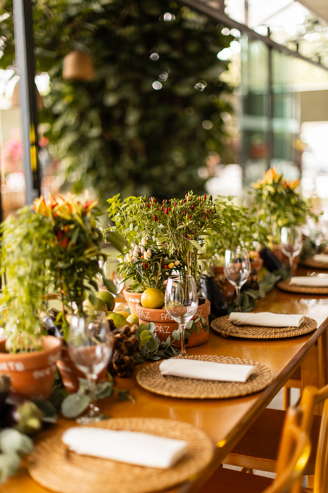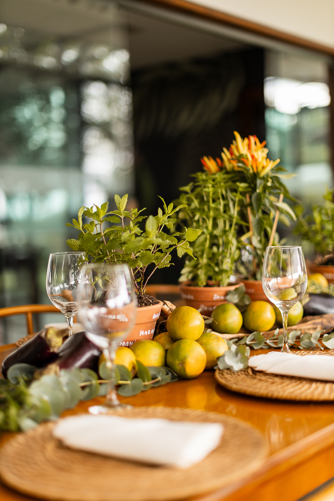 Destaque também para a decoração da Cris Barbosa, que arrasou com a pegada simples, aconchegante e criativa. Os vasos de barro com palavras otimistas combinados com ervas e frutas ficaram perfeitos!
