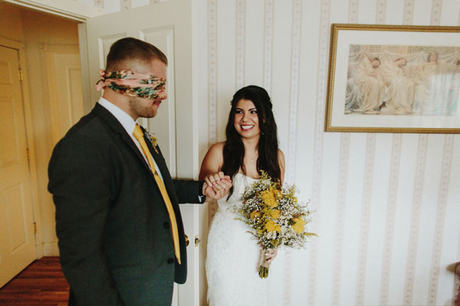 Normalmente o casal fica separado por uma porta ou parede e apenas as mãos se encontram, mas também vale apostar em vendas, assim os noivos podem se abraçar. Só não vale espiar, hein?