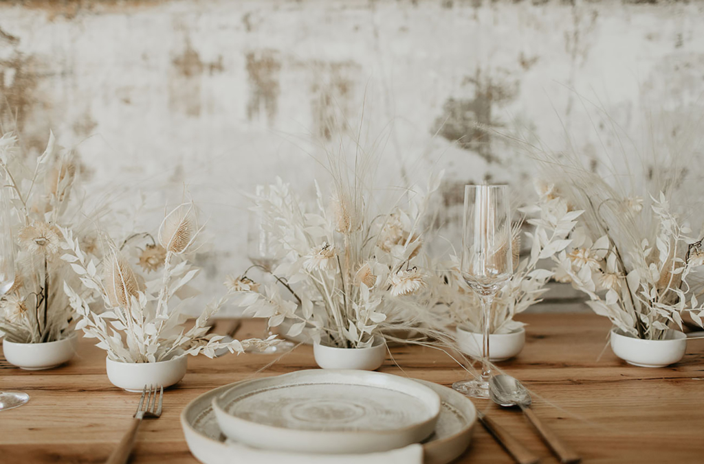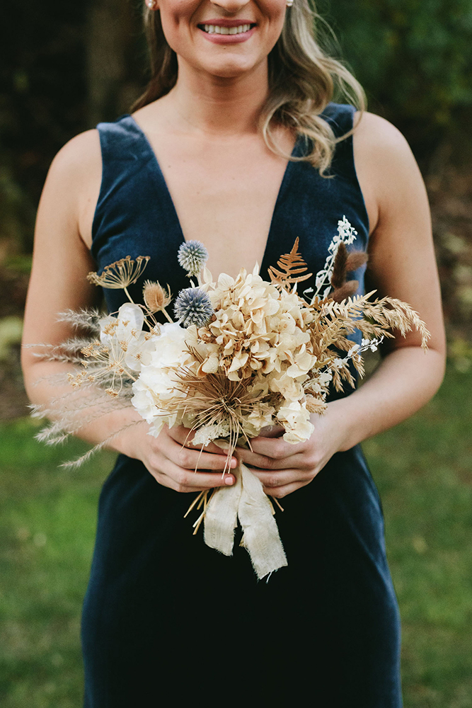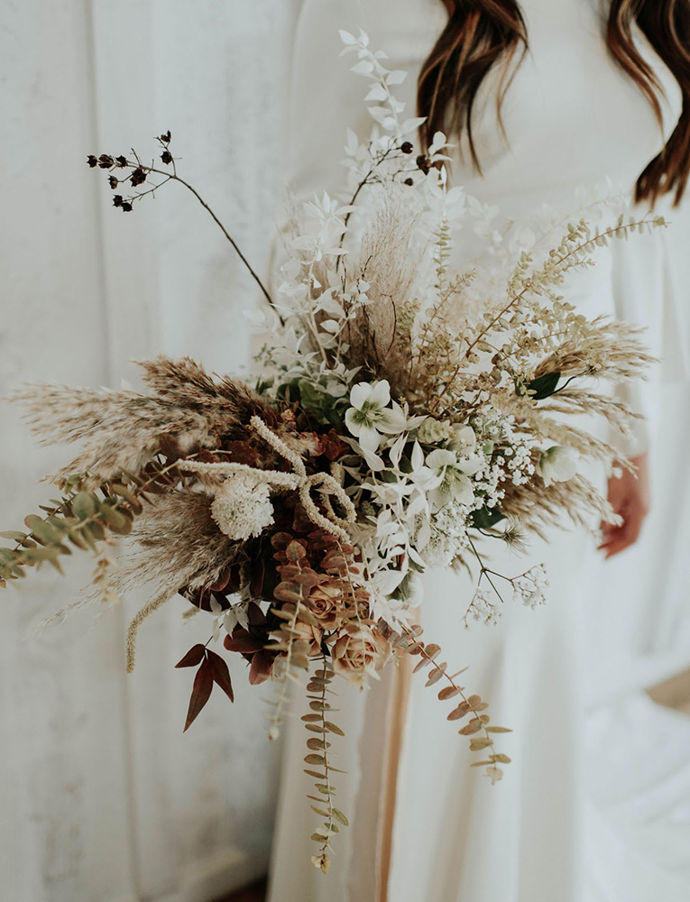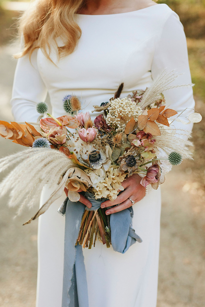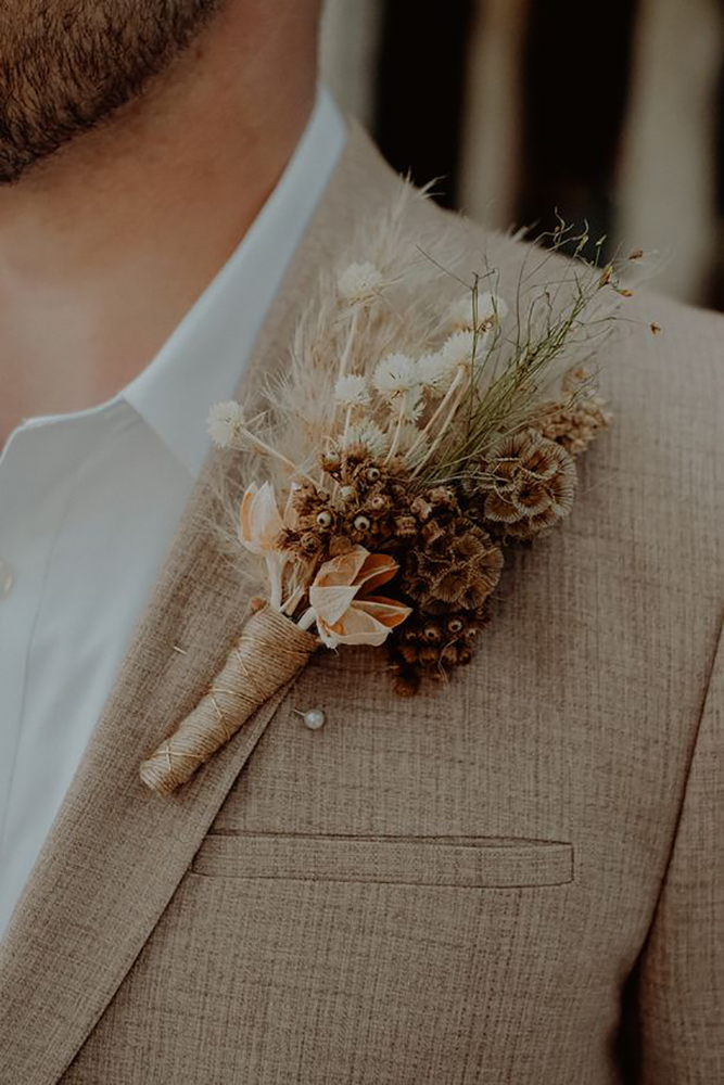 Embora tenha tudo a ver com o visual descontraído dos casamentos ao ar livre, as flores secas encaixam bem em celebrações modernas e caem como uma luva para a estética minimalista.