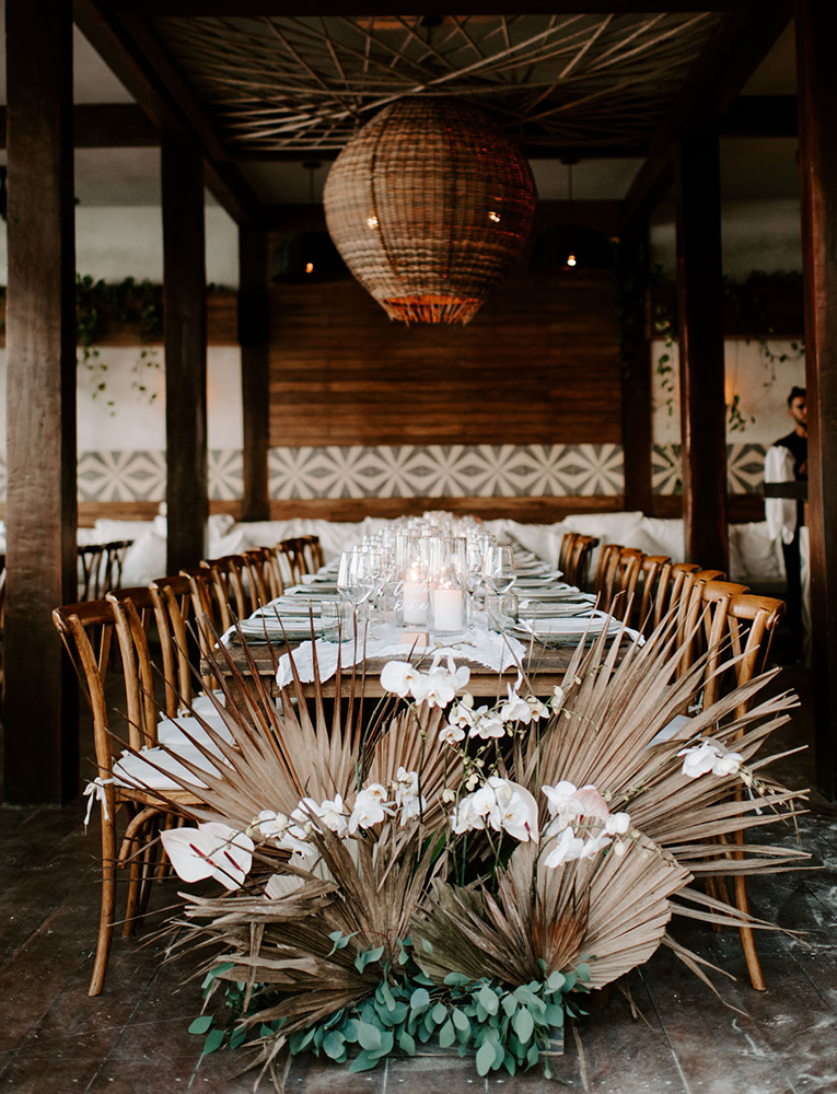 Nas mesas a beleza é ainda mais impactante. Seja com aéreos grandiosos ou arranjos mais delicados, os secos dão o ar da graça com muita imponência, abraçando os ambientes e tornando-os extremamente charmosos.