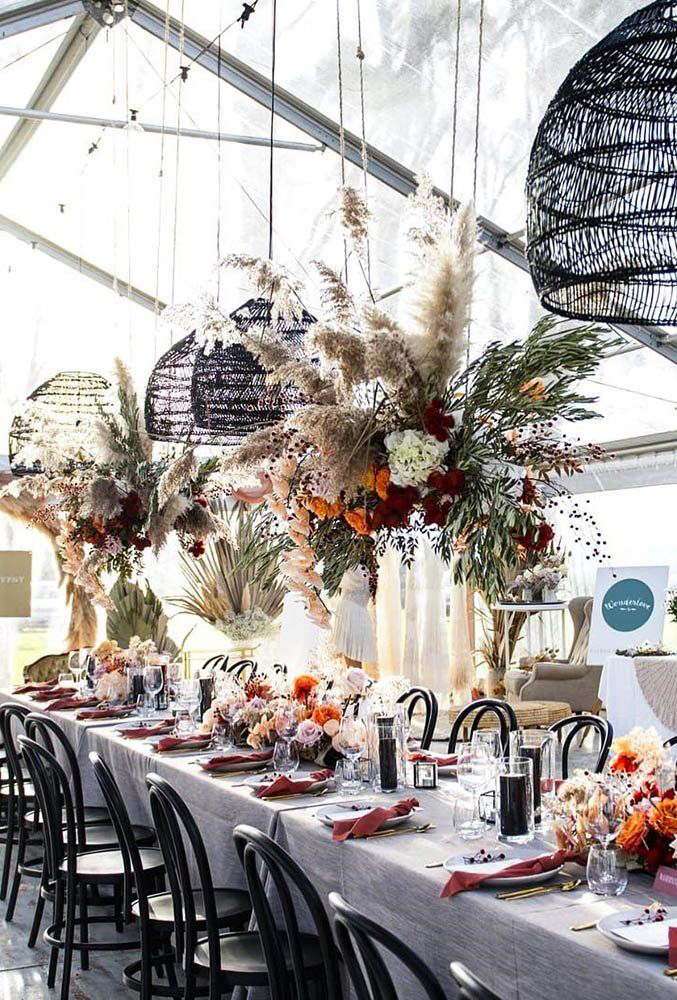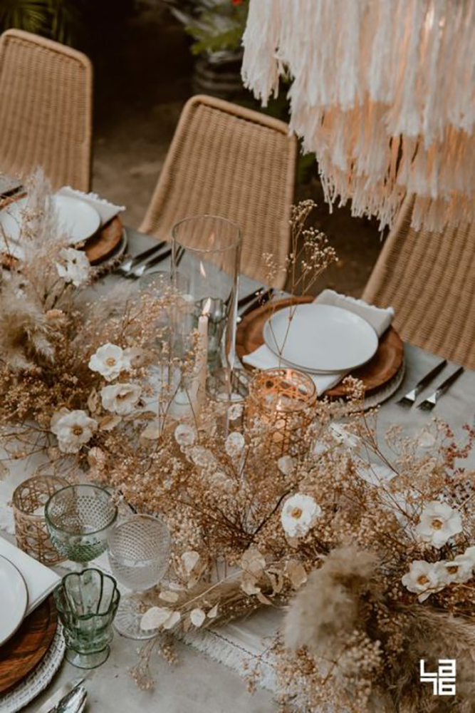 Sozinhas ou misturadas com elementos frescos, as flores secas tem tudo a ver com a pegada leve dos casamentos boho, mas também aparecem em outros estilos de decoração.