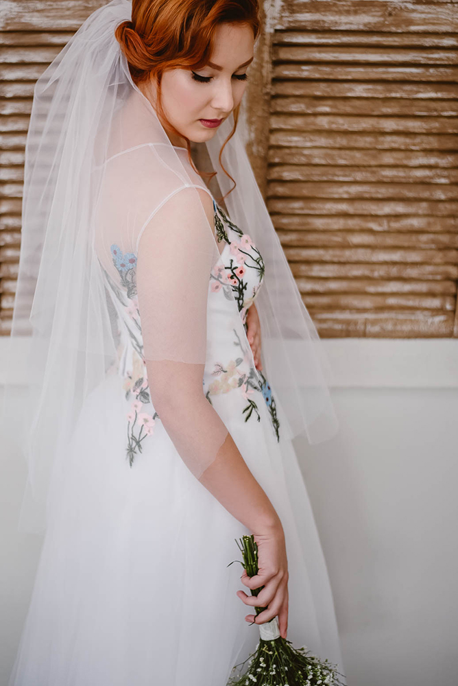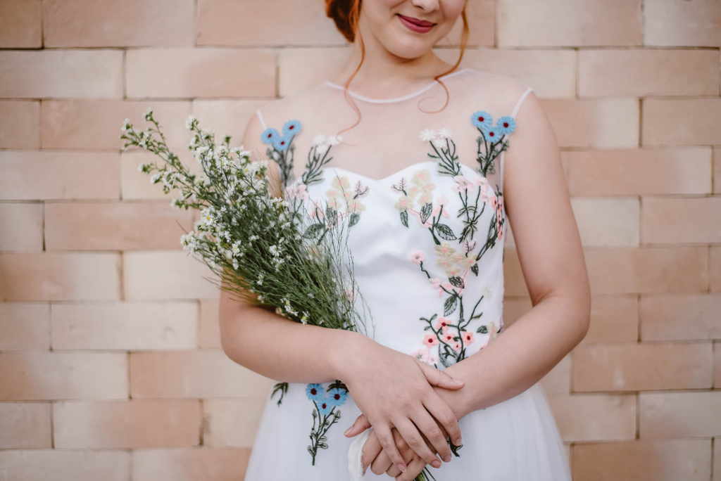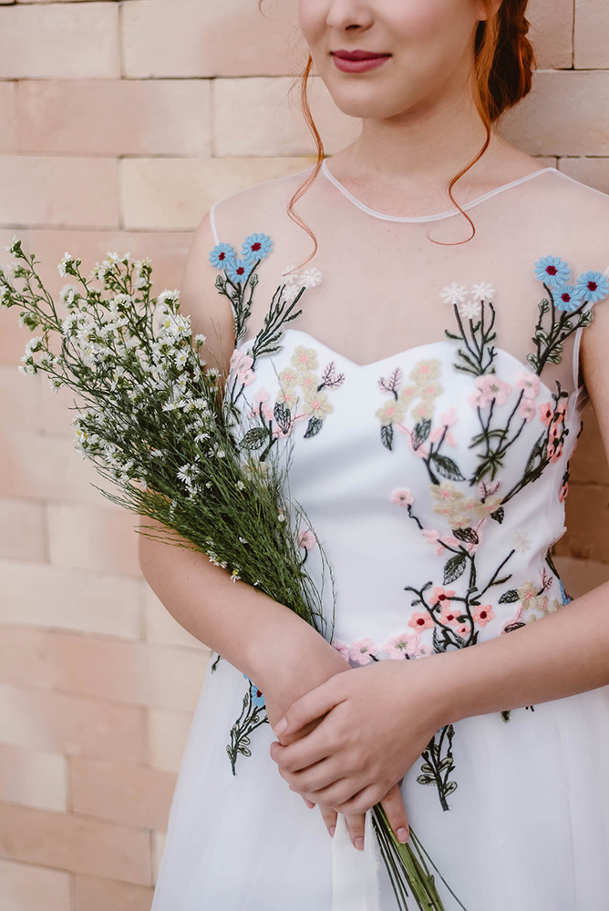 O modelo com bordados coloridos é encantador, perfeito para qualquer estilo de casamento!