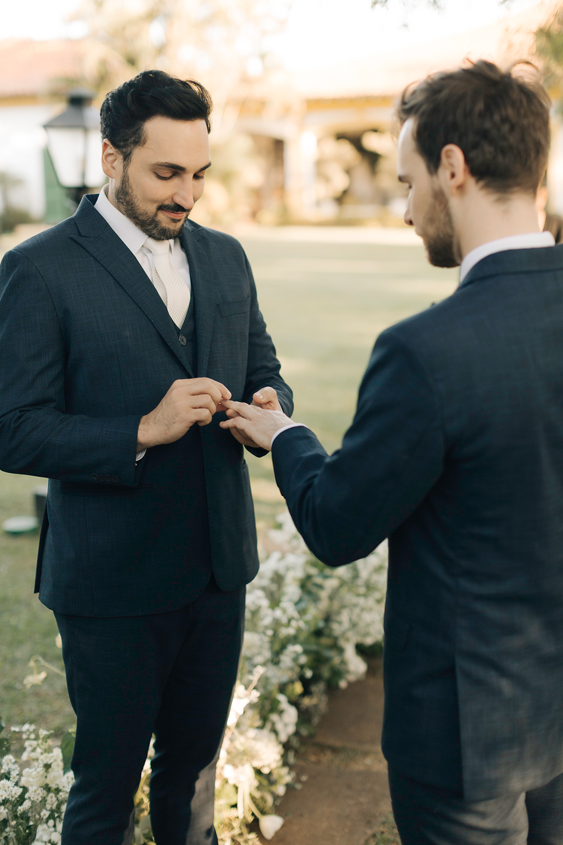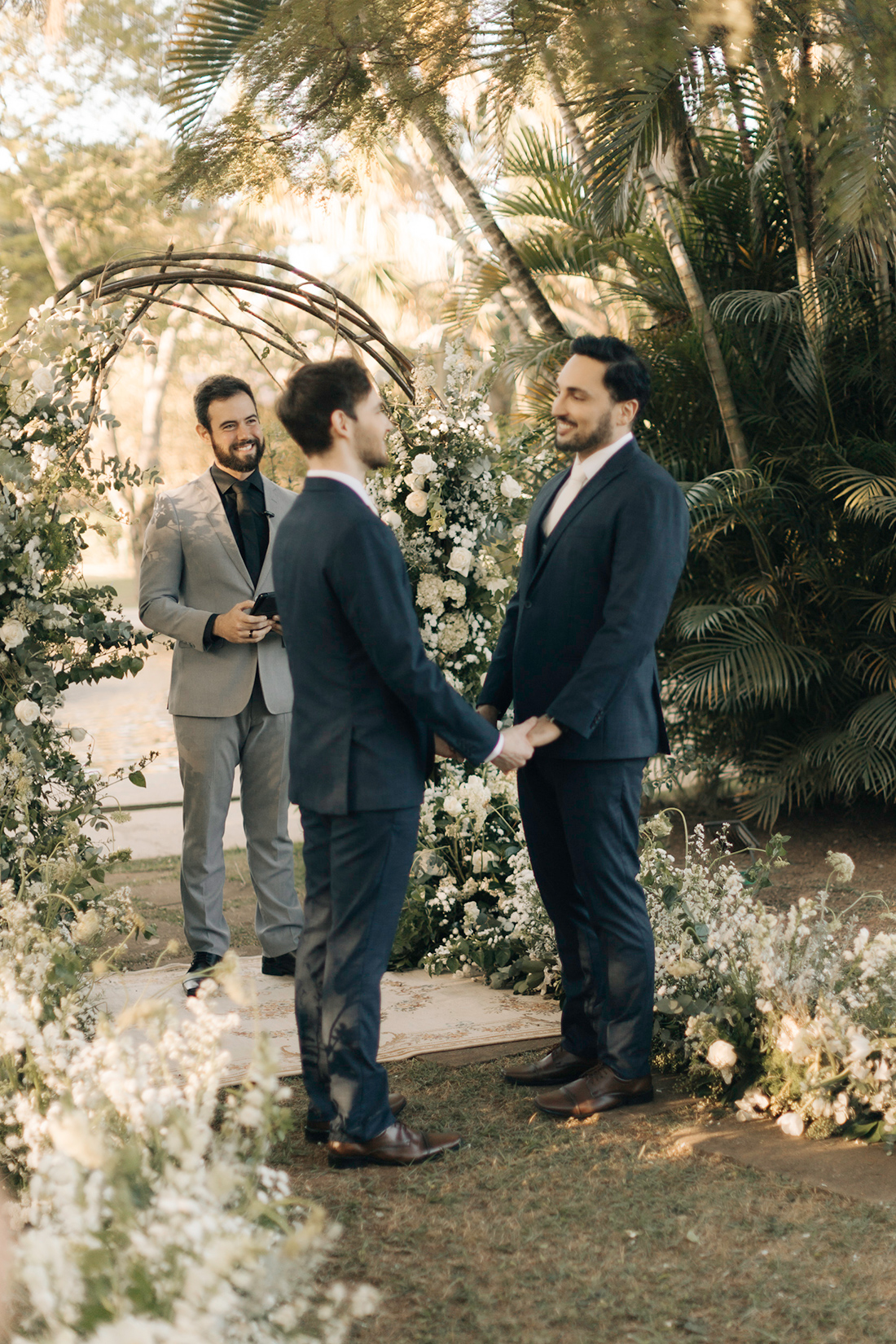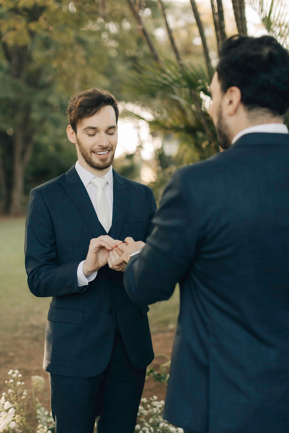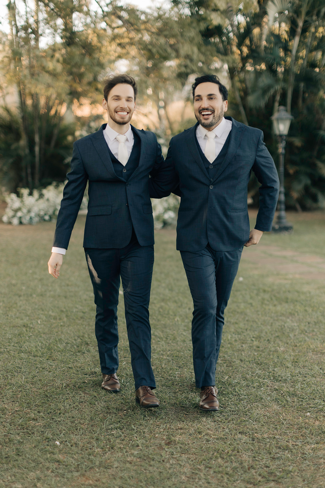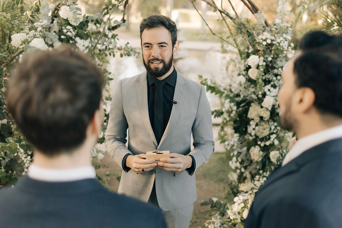 Quanto ao look dos noivos, a ideia foi trazer uma pegada leve e sofisticada na mesma medida. Para isso, Estevam e Hugo escolheram trajes iguais, ambos azuis com gravata off white e sapato marrom.