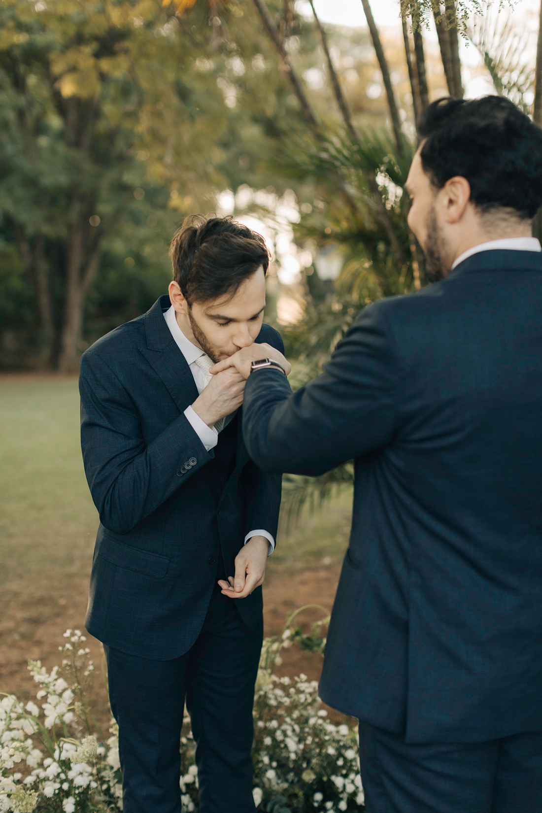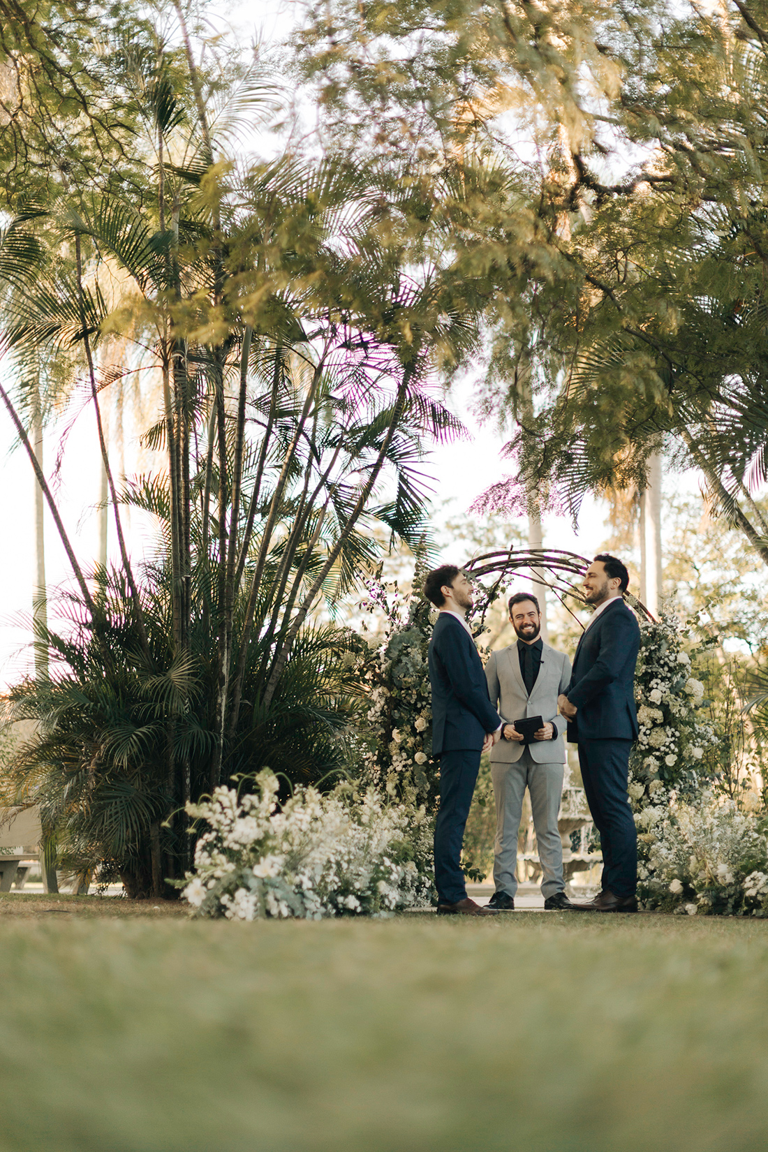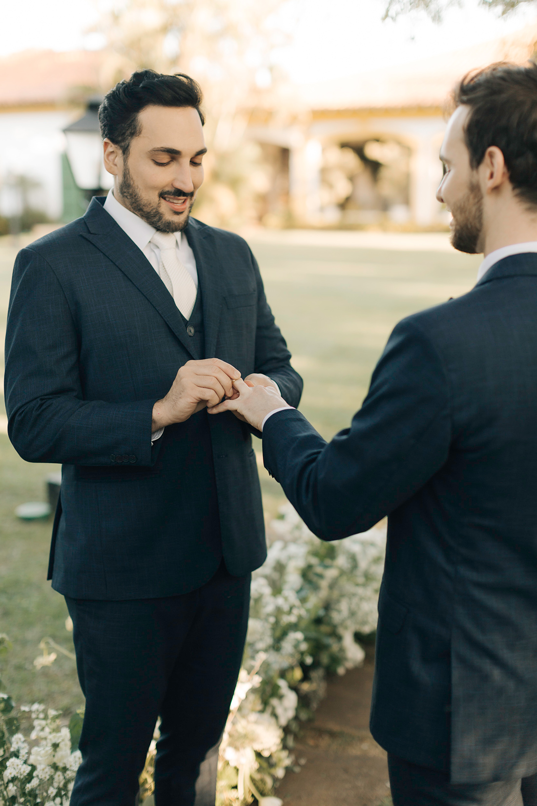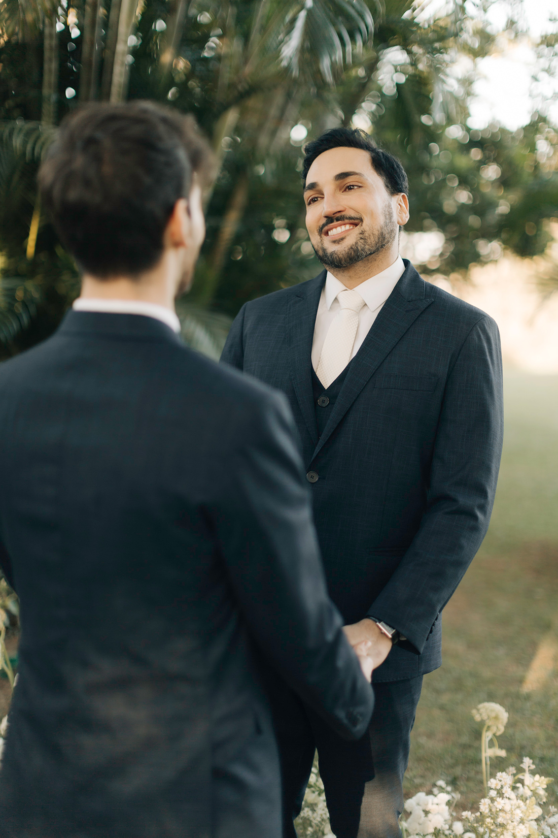 Quanto ao look dos noivos, a ideia foi trazer uma pegada leve e sofisticada na mesma medida. Para isso, Estevam e Hugo escolheram trajes iguais, ambos azuis com gravata off white e sapato marrom.