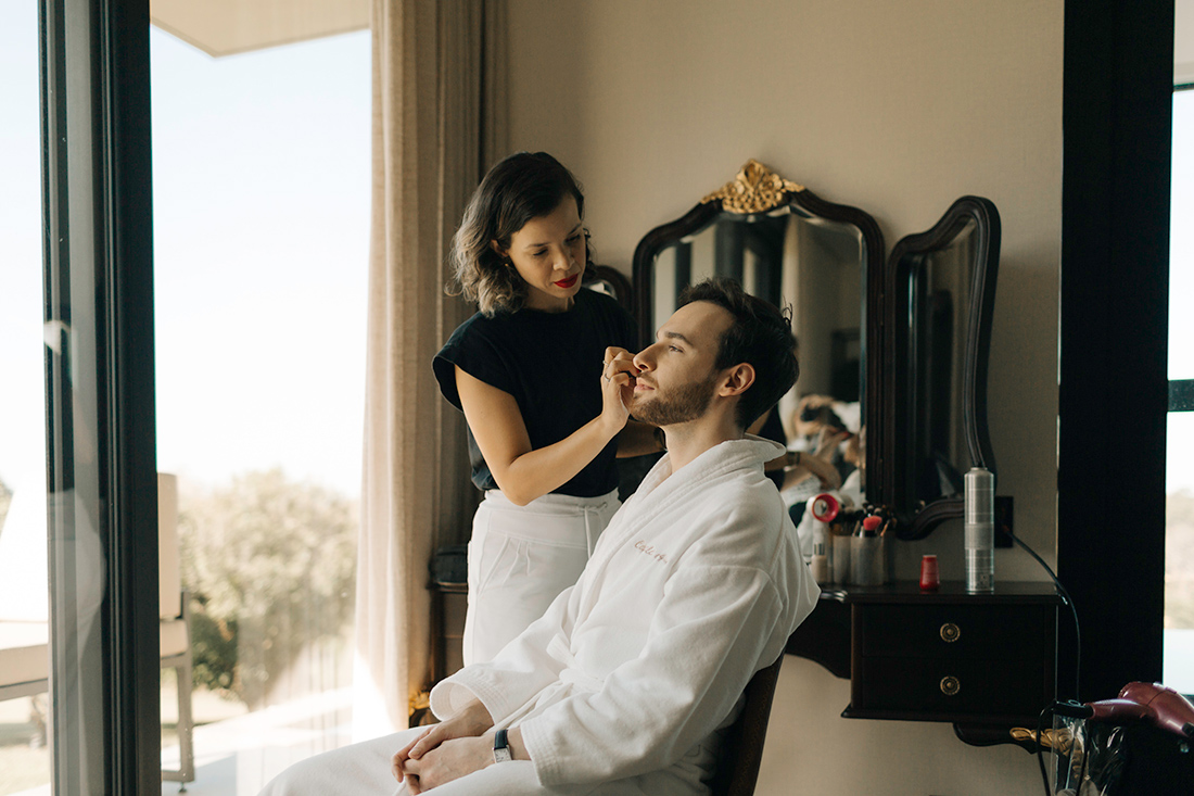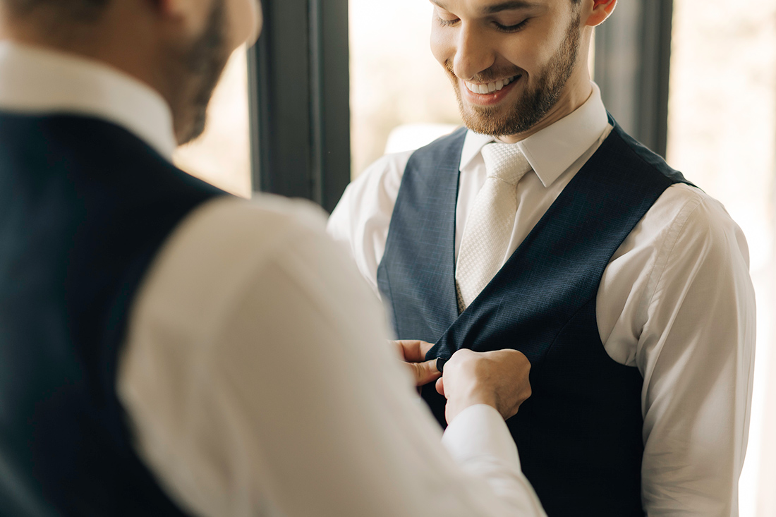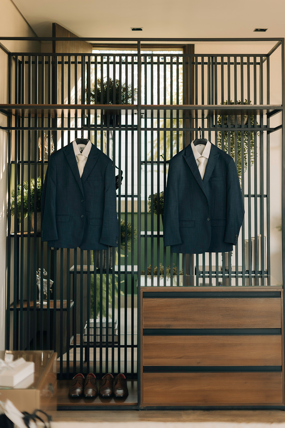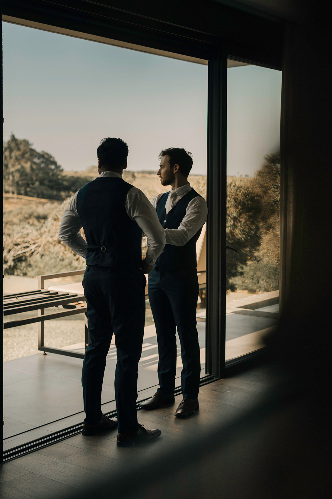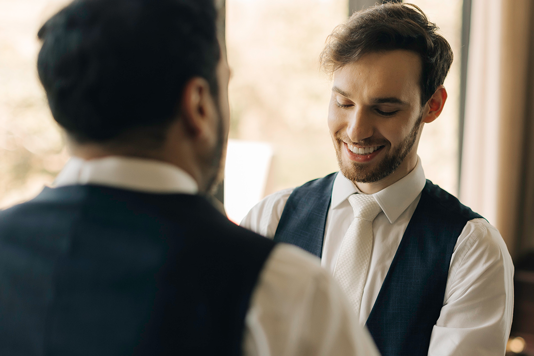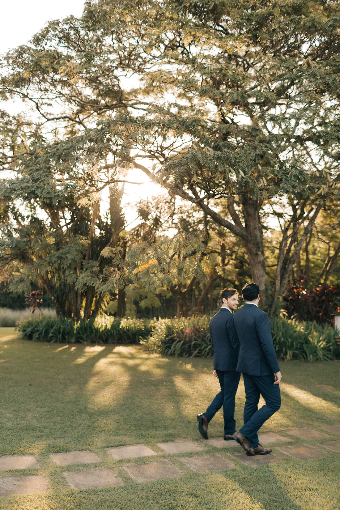 Quanto ao look dos noivos, a ideia foi trazer uma pegada leve e sofisticada na mesma medida. Para isso, Estevam e Hugo escolheram trajes iguais, ambos azuis com gravata off white e sapato marrom.