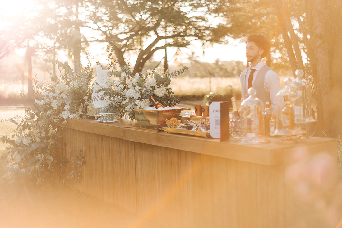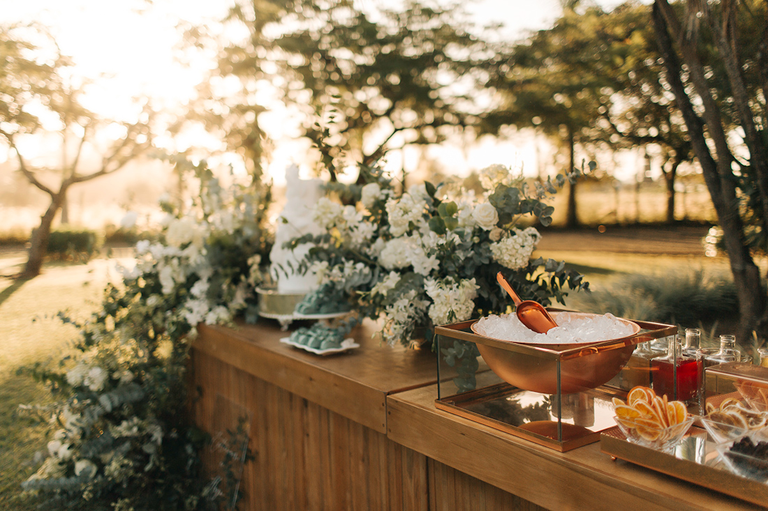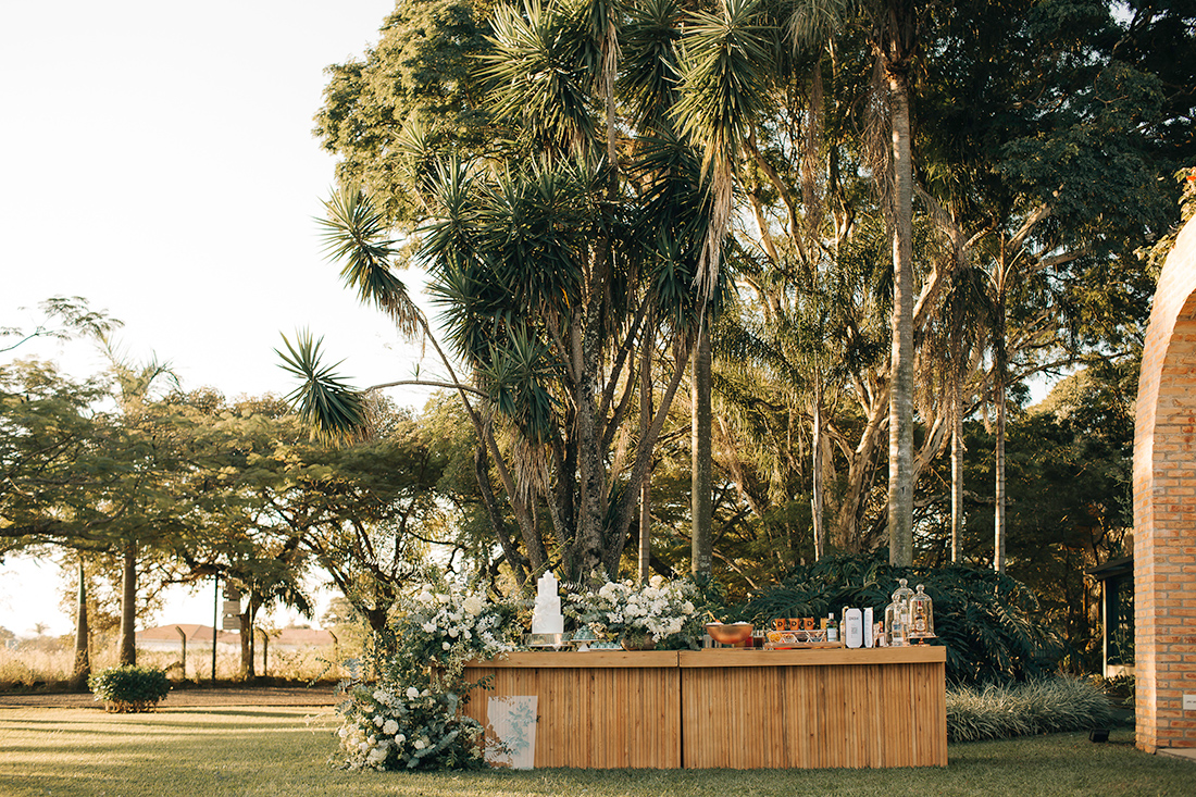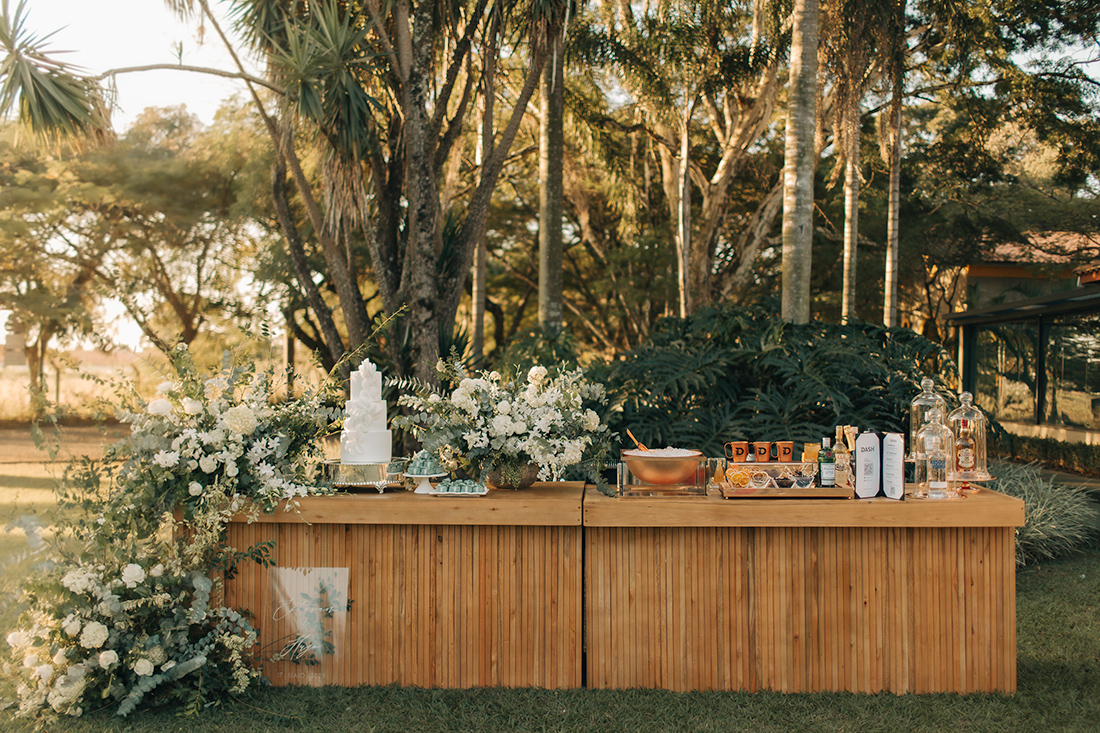 Ao escolhermos substituir a velha mesa de doces, por exemplo, o balcão da Lunika caiu como uma luva. Ele recebeu a Dash Coquetelaria e seus drinks criativos e ainda acolheu o bolo. A criação da Cake My Day ficou simplesmente perfeita. Mal pude acreditar quando vi!