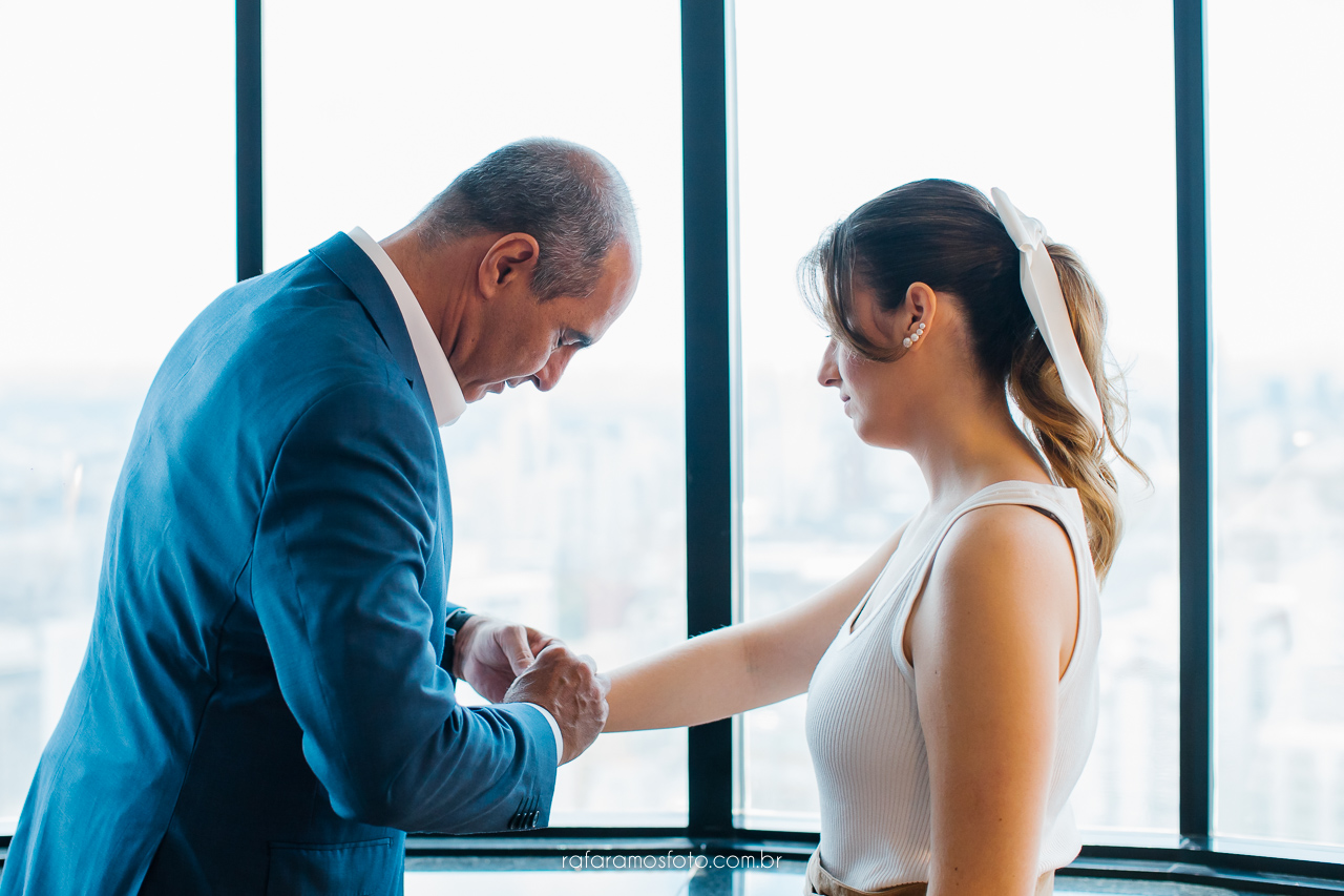 Além disso, as escolhas flertam com o estilo minimalista. Do vestido comprado em Londres ao acessório da Giovana – um lindo laço em tecido -, os detalhes ajudam a compor o clima leve.