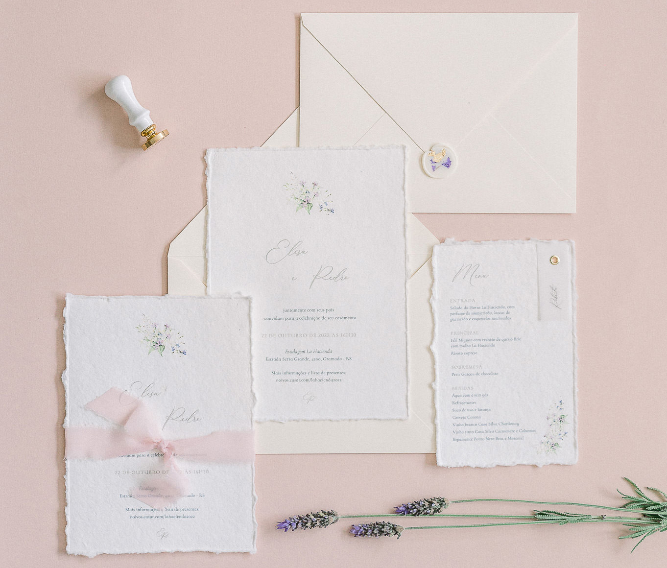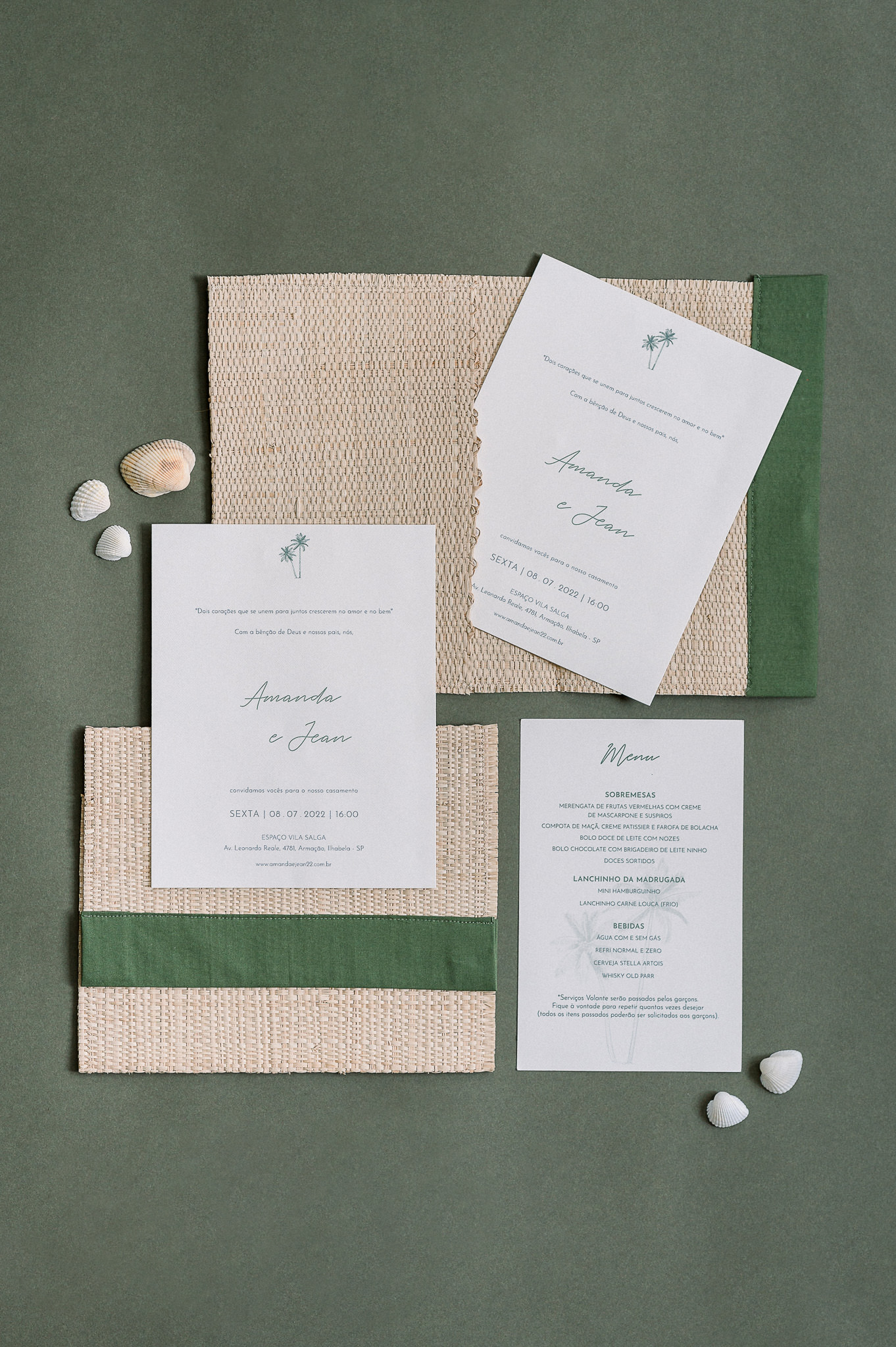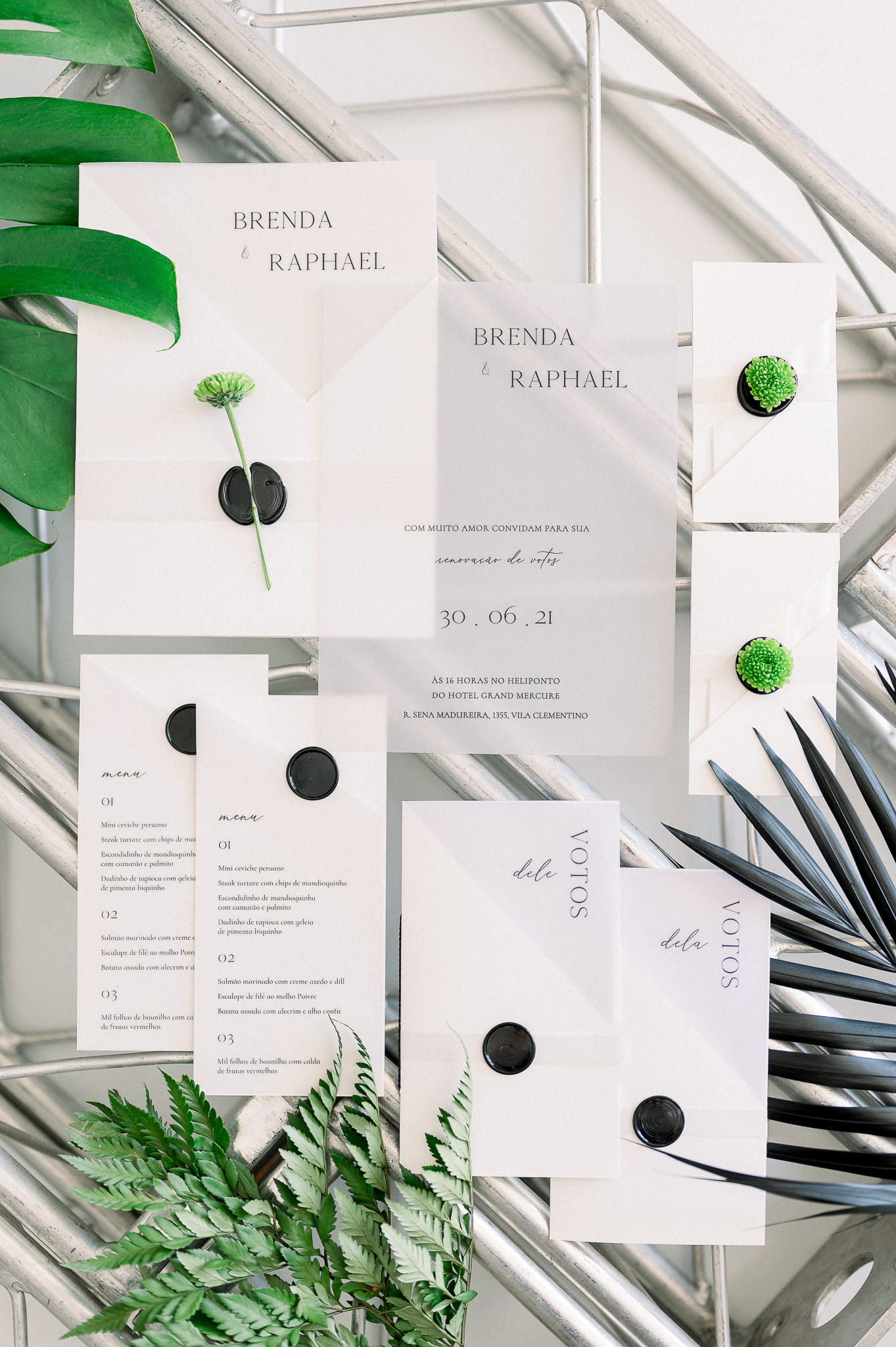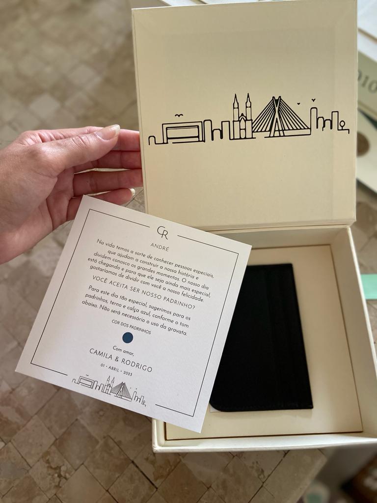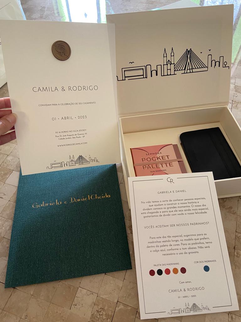 Na minha opinião, os itens indispensáveis são: save the date digital, convite impresso, cartão e presente para os padrinhos (caso houver). Já para o dia da festa, o menu, visto que hoje em dia muitas pessoas tem restrições alimentares. Logo, é sempre legal mostrar o que será servido no evento.