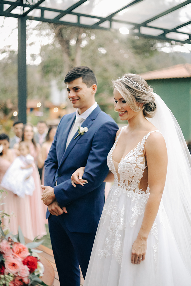 Reparem nos arranjos florais e no arco que enfeitou o altar. Um visual digno de Pinterest!