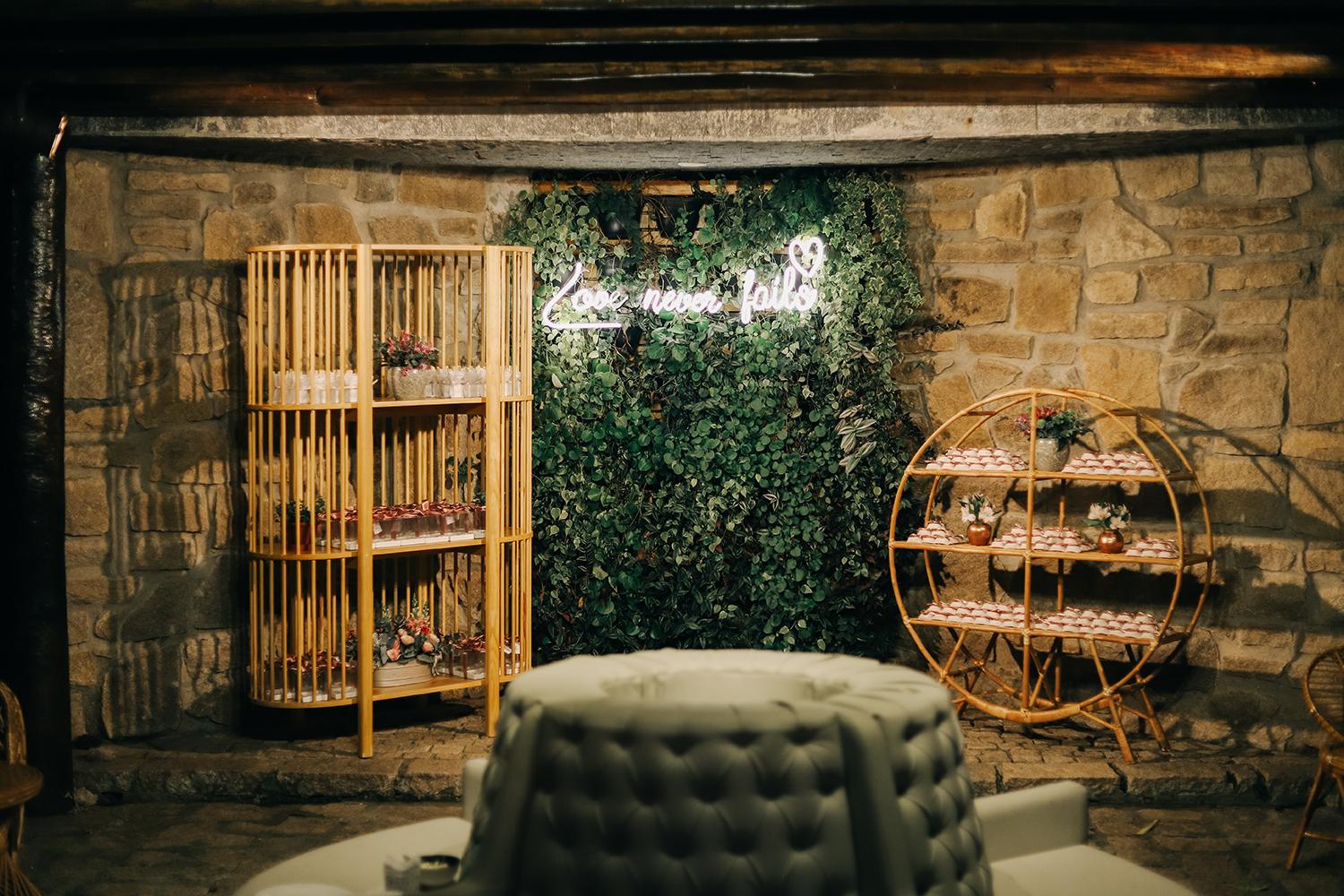 Combinados com o verde do espaço, os tons delicados ganharam ainda mais destaque, transformando a Dona Inês em um verdadeiro conto de fadas moderno.