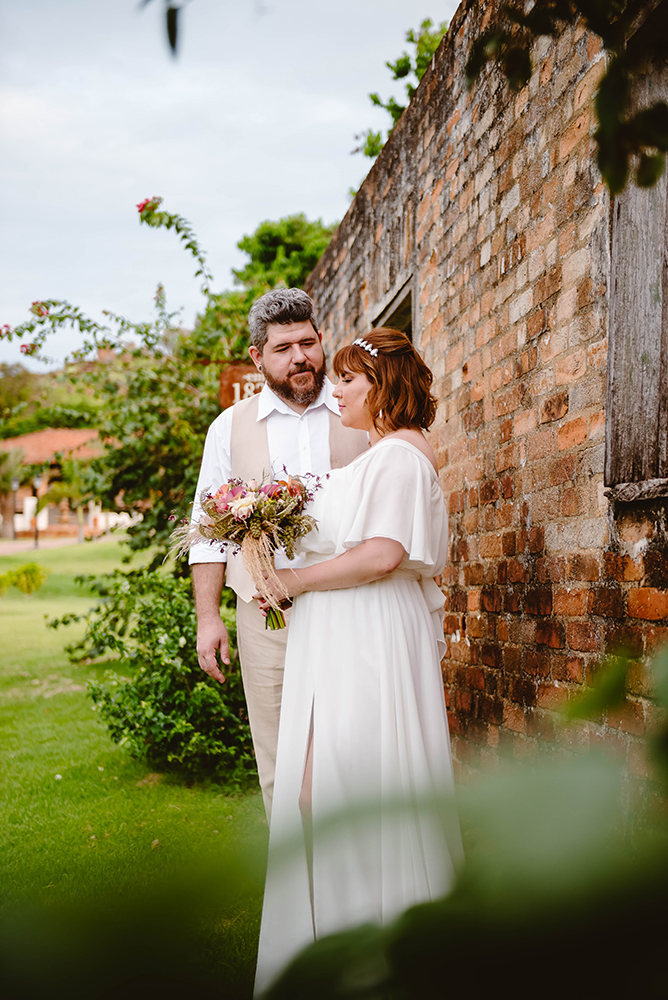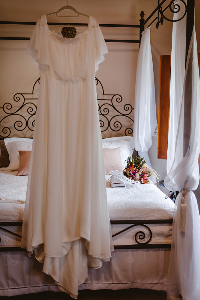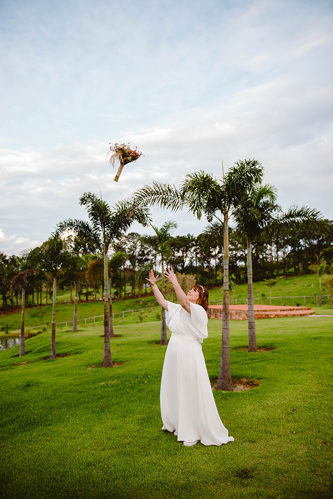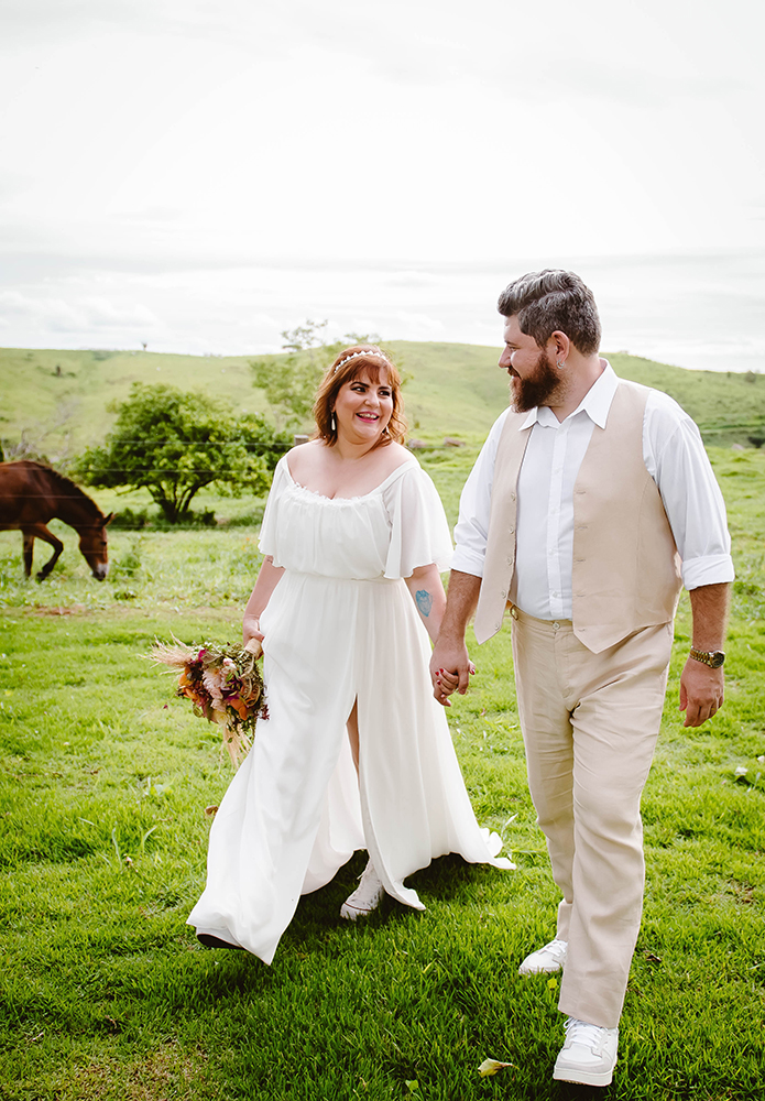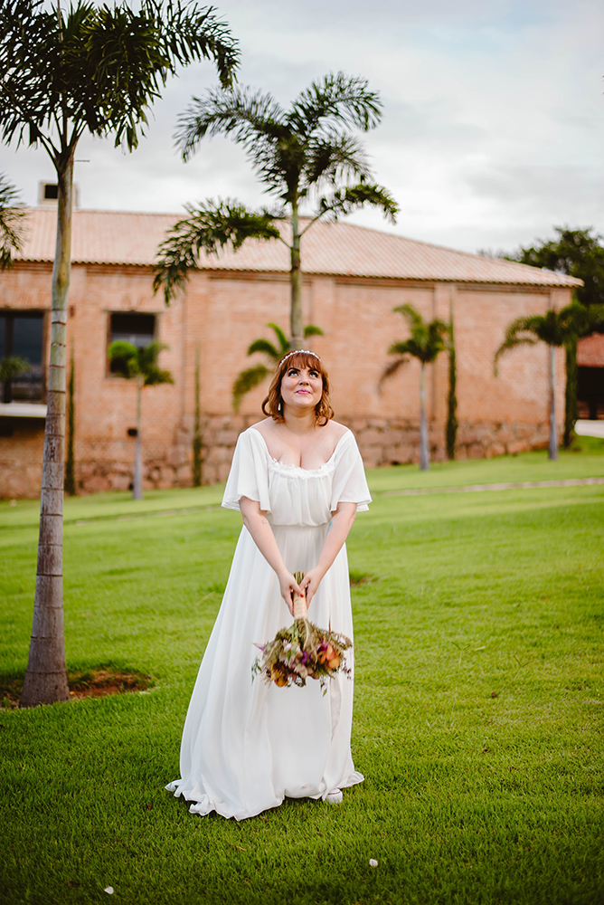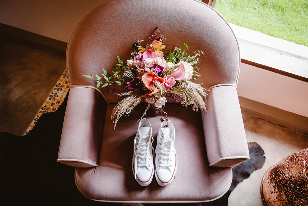 O vestido – essa belezura esvoaçante – é da Julia Pak, os acessórios são da Alessandra Cazzaro, o buquê boho é da Lamore e sapato é… Converse!