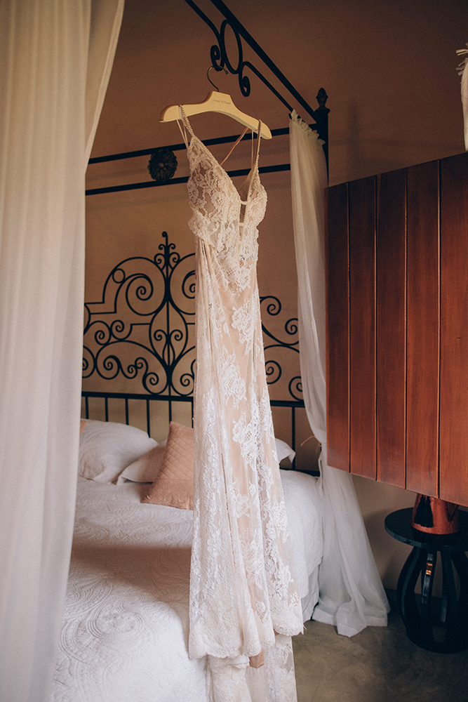 ♥ O vestido de noiva. Um lindo modelo em renda com decote e alcinhas.