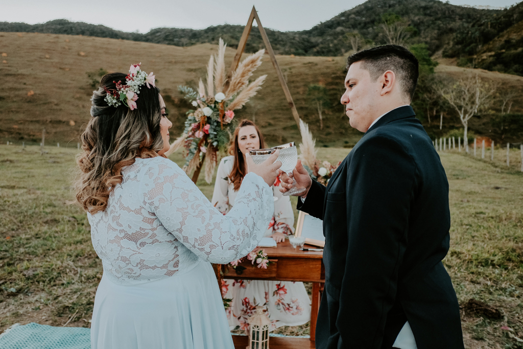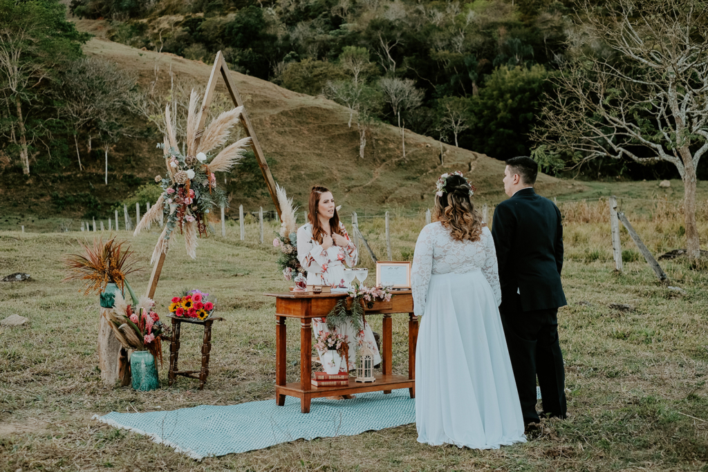 Os dois casariam esse ano com todos os elementos tradicionais: cerimônia, festa, convidados, gastronomia… Por conta da pandemia, tiveram que adiar para o ano que vem, mas o sonho da Julia era ter uma celebração intimista, em meio a natureza, com uma conexão mais íntima entre ela, seu amor e Deus. Foi então que ela me procurou com essas informações e, desde então, fui correndo atrás para que esse sonho fosse realizado.