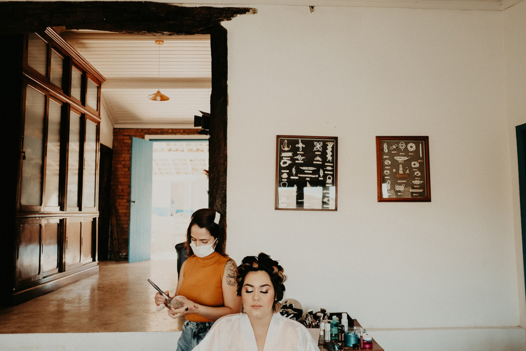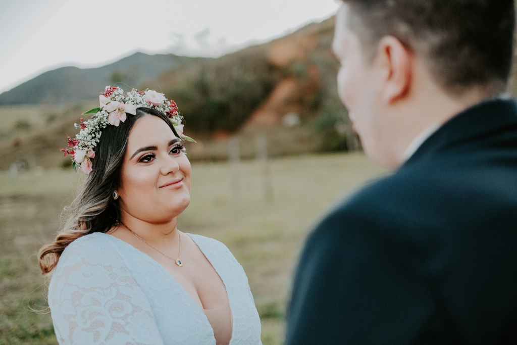 “Chegamos no local e não tinha energia, corremos para procurar alguma casa próxima à fazenda e encontramos um casal que cedeu a energia e seu quintal para prepararmos o cabelo da Julia. Retornamos (com a energia restabelecida) e demos continuidade ao making of da noiva. A maquiagem ficou incrível como sempre, afinal, minha esposa arrasa! O cabelo então, nem se fala, uma obra de arte que a Isabela fez.
