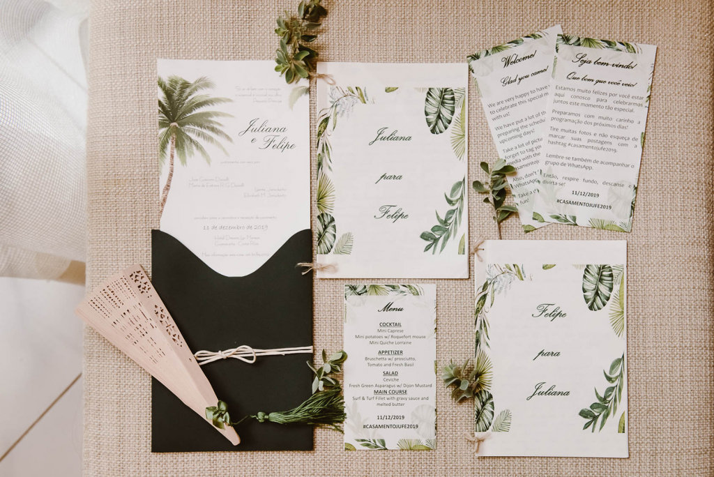 Grande parte da papelaria, assim como os kits dos pais e padrinhos, foram feitos por mim, assim como os kits para os convidados, que foram distribuídos para garantir a diversão na piscina durante os dias de resort.