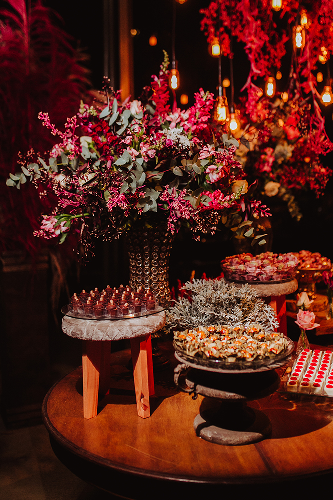 A proposta aberta, com natureza e decoração boho, teve o tom marsala como cor principal, com direito a trio de bolos e outros itens charmosos.