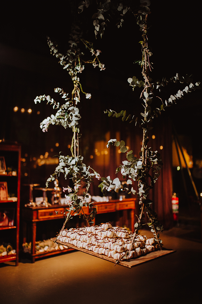 “Por mais que tenhamos optado pela cerimônia na igreja, sempre quisemos um lugar com natureza para a festa. E assim fomos decidindo pela decoração: algo mais desconstruído na mesa do bolo, nada tradicional.