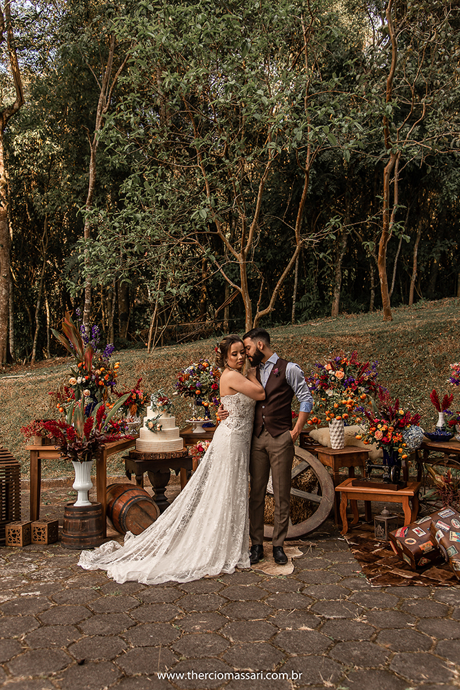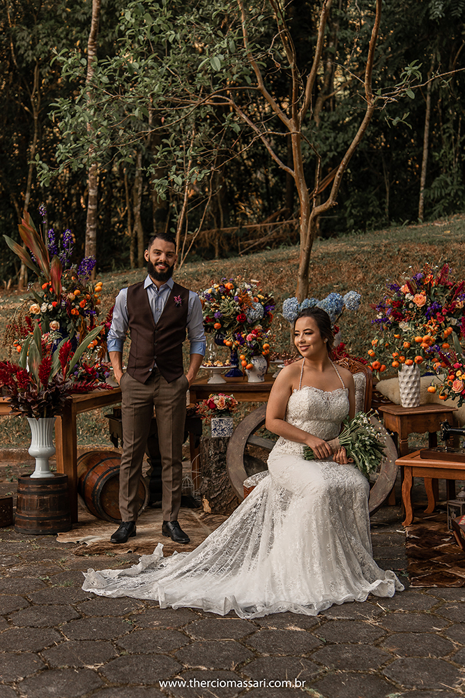 Idealizado para casais que curtem o estilo country e sonham com o casamento rústico, o editorial Lovely Country traz detalhes que vão das botas de couro até móveis de madeira, cenário verde e muitas flores.