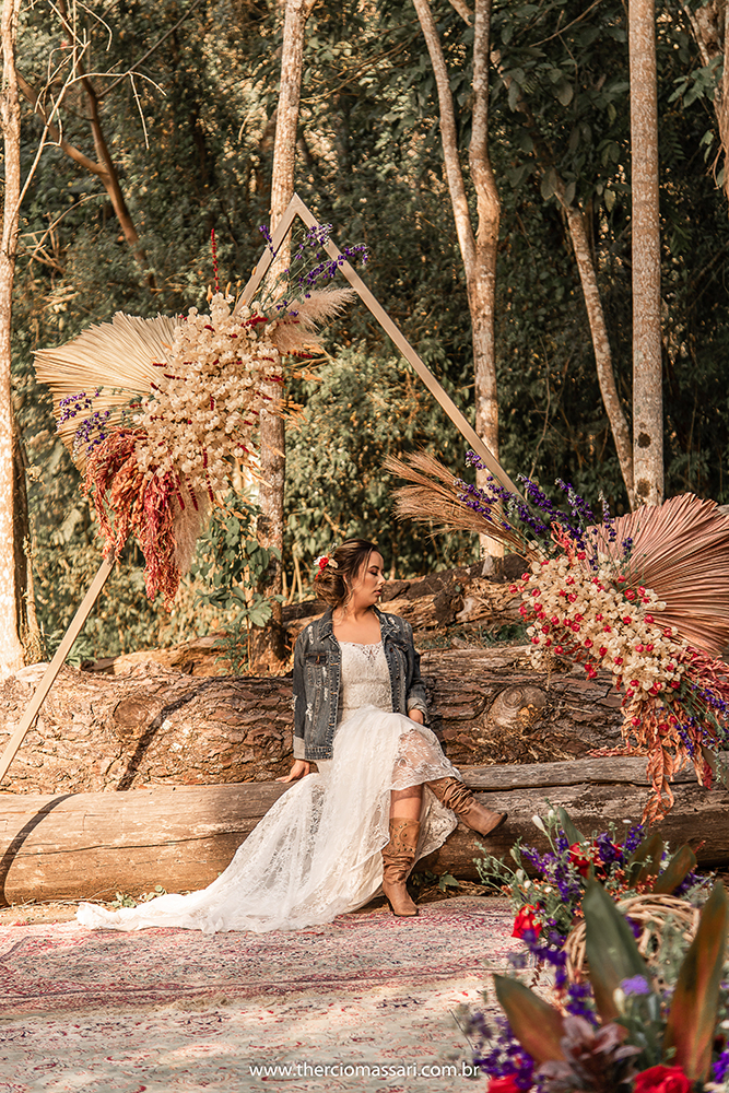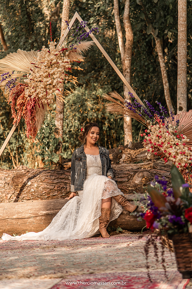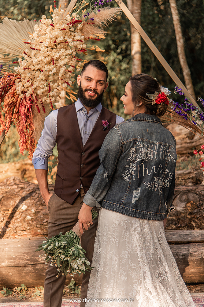 Com botas, jaqueta jeans e beleza natural, além de um lindo arranjo com flores vermelhas no cabelo, a noiva ficou perfeita! Um look divertido, mas ao mesmo tempo suave e romântico.