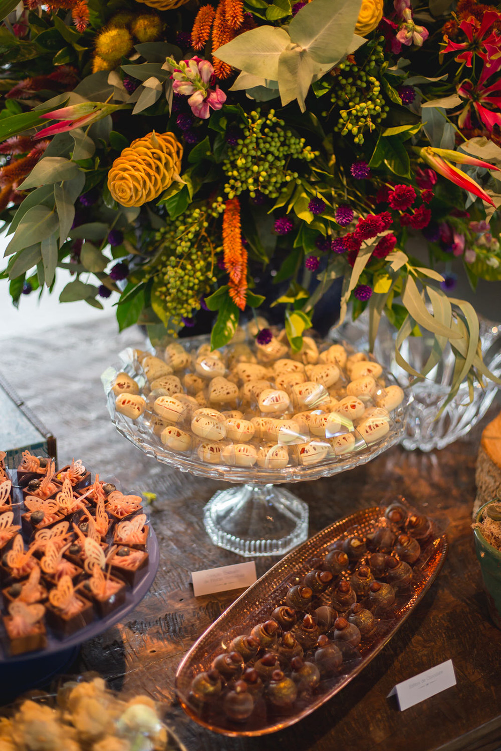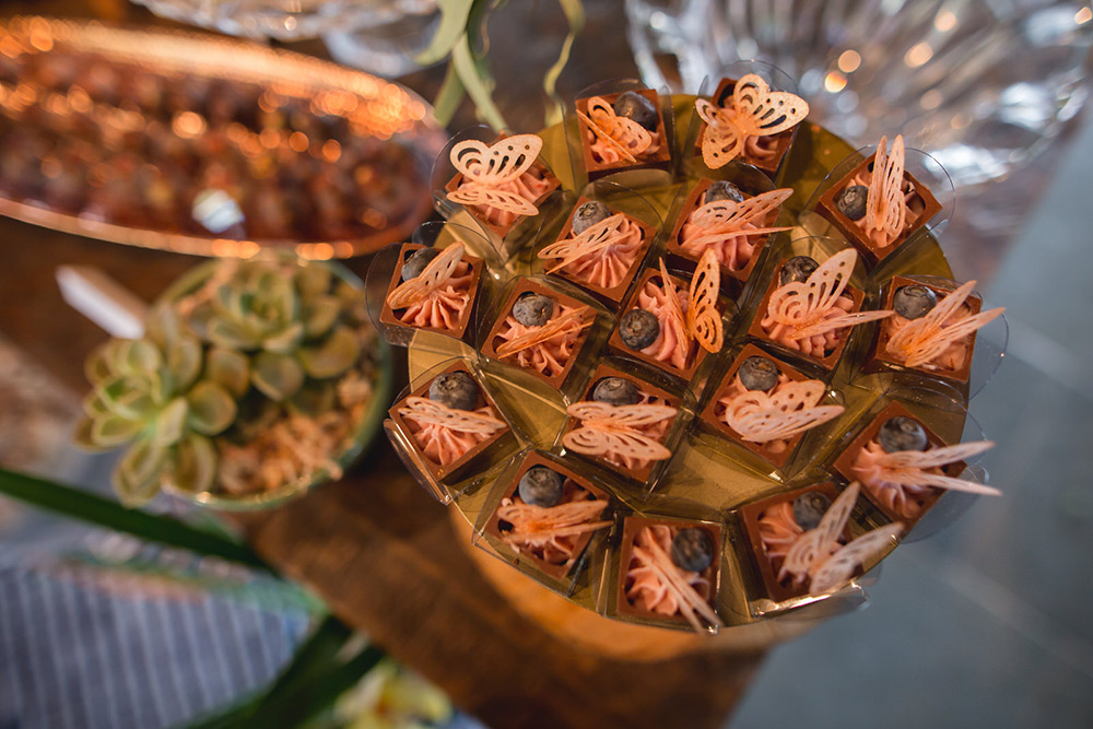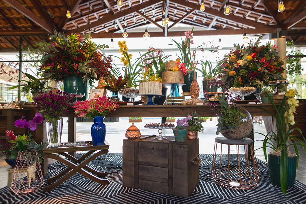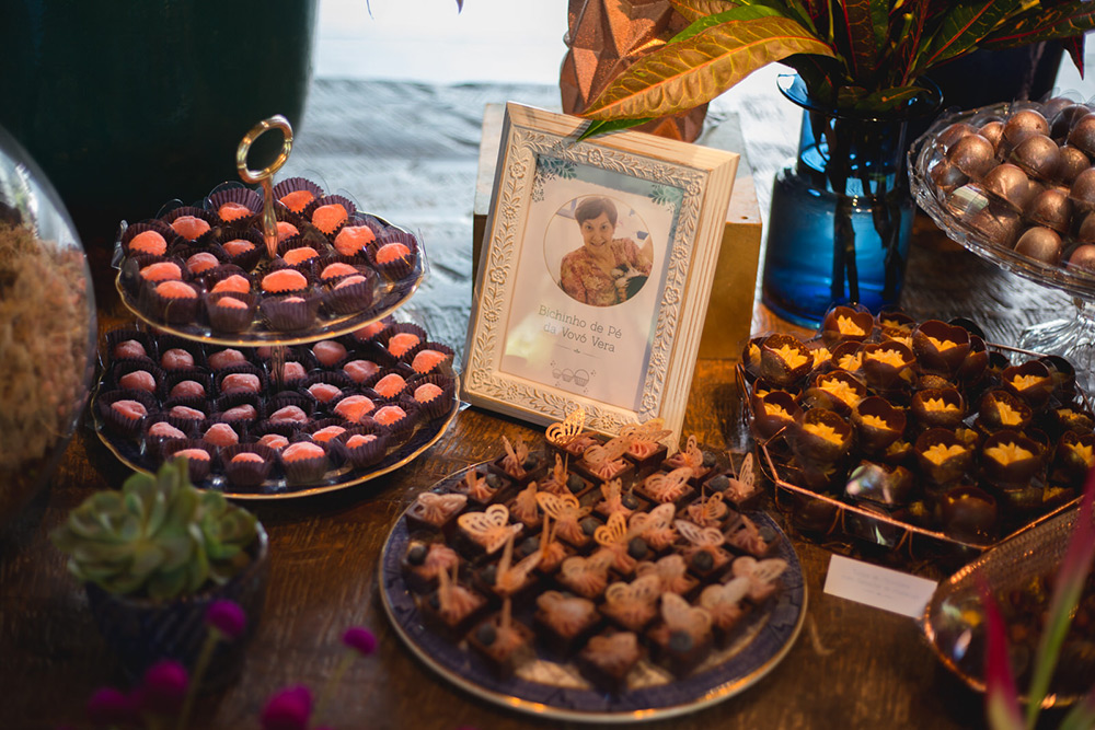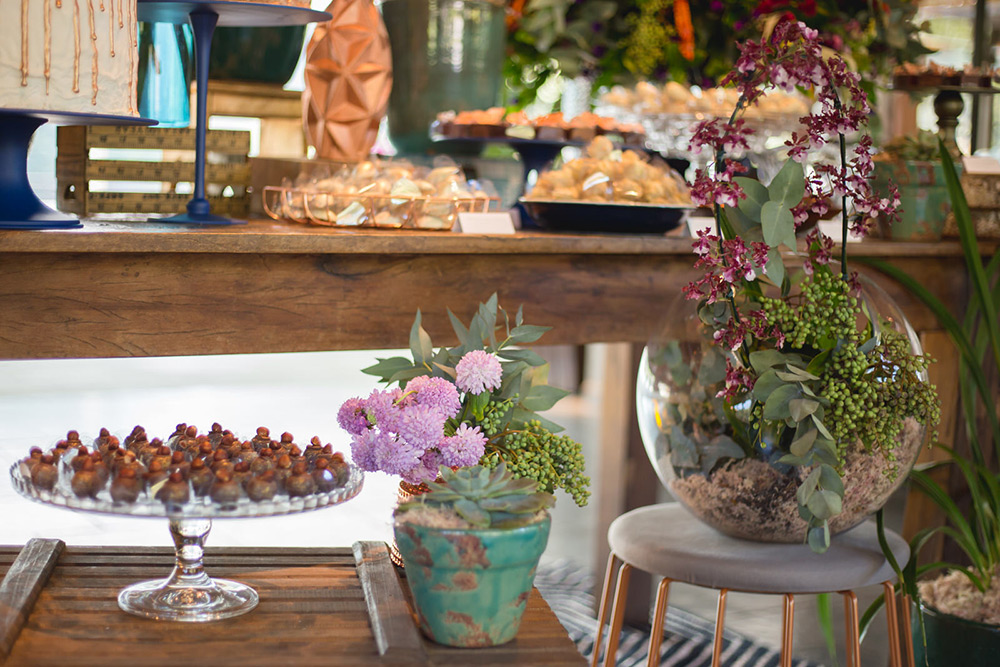 A decoração colorida, rica e detalhista ficou a cargo da Fatto Manu, que caprichou na mistura de texturas e elementos. A área da cerimônia ficou um deslumbre, assim como a mesa de doces! Aliás, os doces da Hey Sweet incluíram uma linda homenagem para a avó da noiva, com sua receita de bicho de pé entre as guloseimas.