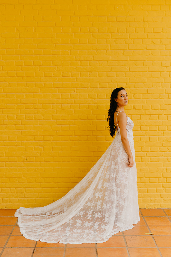 Ela usou um deslumbrante vestido de alcinhas com cauda e renda e desfilou os longos cabelos soltos. Uma verdadeira princesa!