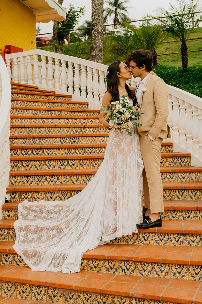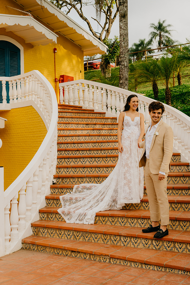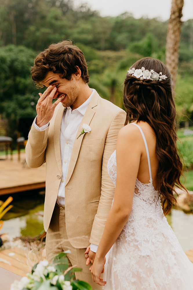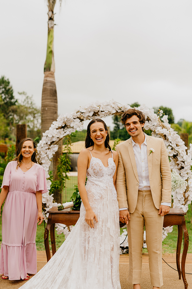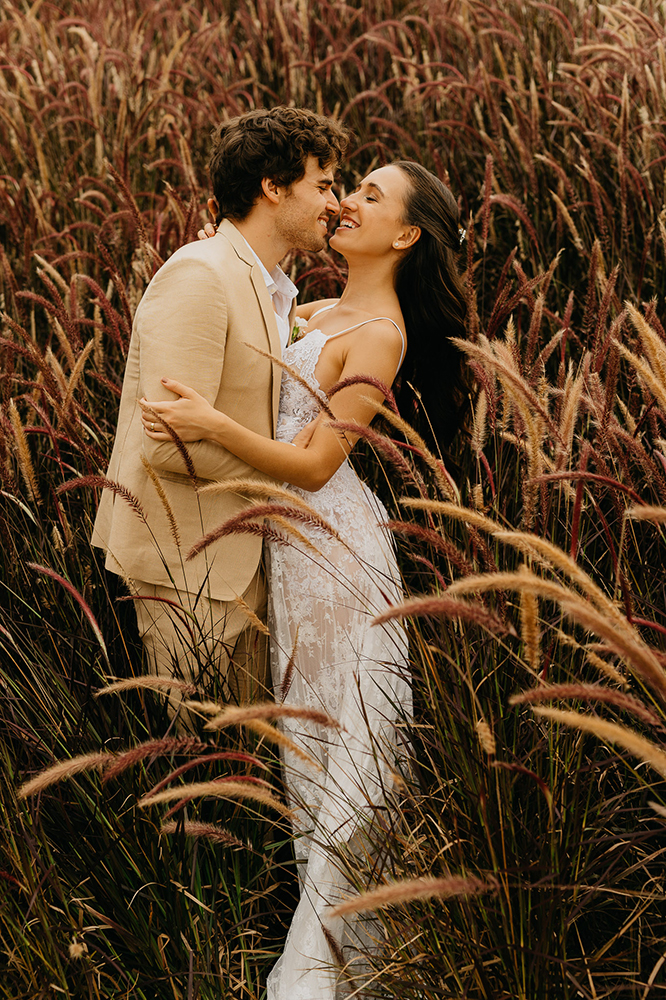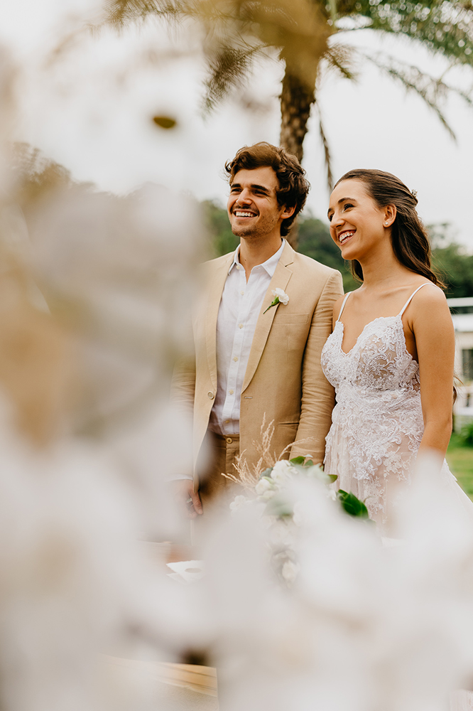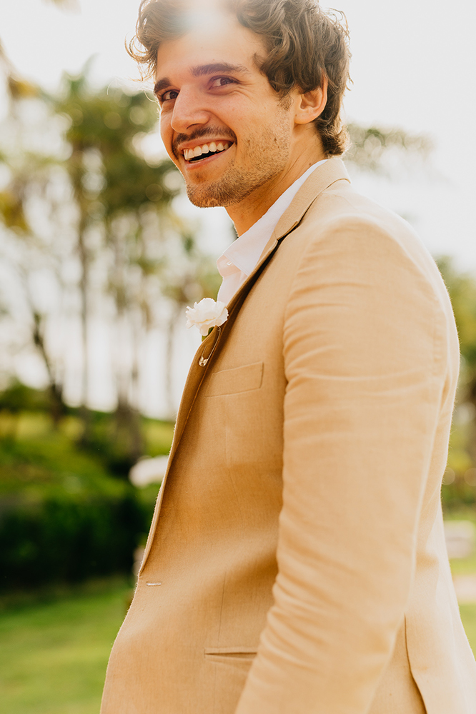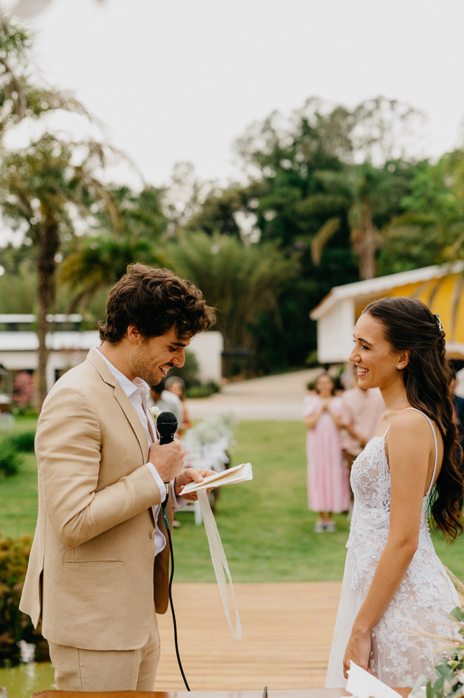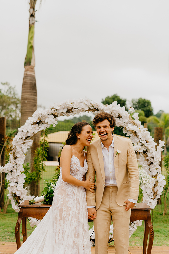 O noivo, por outro lado, adotou o traje em linho assinado por Maximus Rigor. Ambos absolutamente leves, descontraídos e na medida para a celebração no campo.